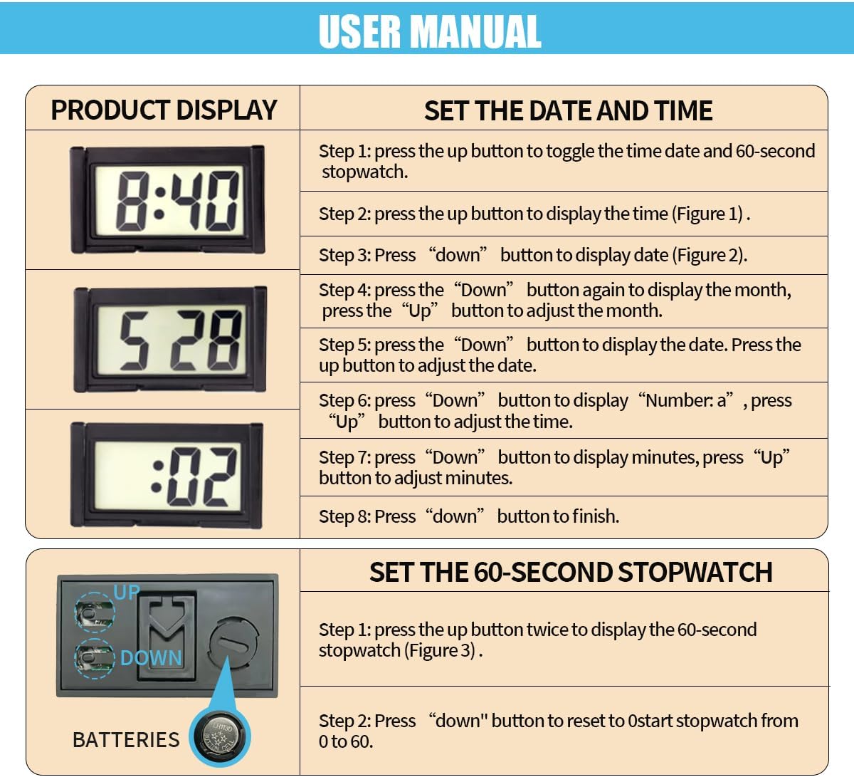 【Easy Setup】:There are only two small buttons on the back of this mini clock for adjustments. The UP button is a toggle button to switch what needs to be adjusted (hours, minutes, etc.) and the DOWN is an adjustment button. Press DOWN several times until “hours and minutes” are displayed. Then press UP to set the hour. Press DOWN once more to display the minutes, press UP to set, and then press DOWN to complete the procedure. and it’s easy to change the batteries.