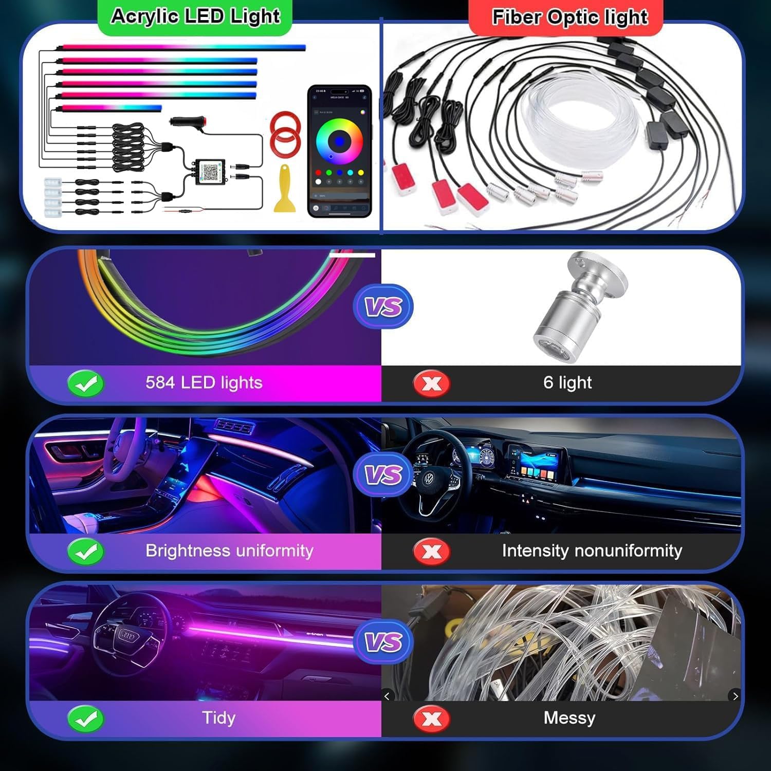 High Brightness & Uniformity: Compared to fiber optic lights, our interior car light uses acrylic material, and the light strip is equipped with hundreds of bright LEDs to ensure bright, soft, and uniform lighting. Whether it’s day or night, make your car stand out!
