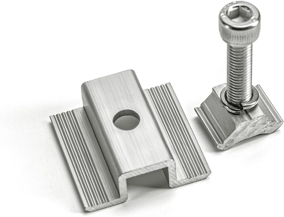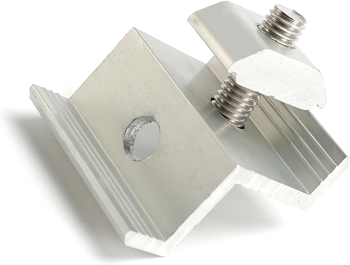 MID AND END CLAMPS FOR SOLAR MOUNTS – Solar panel mounting middle clamps are positioned between adjacent solar panels, while end clamps are placed at the ends of the panels. Come with rubber seals and self drilling screws for a secure fitment.