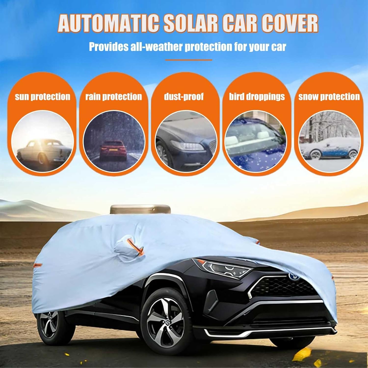 [Solar Charging + 4400mAh Battery]: This automatic car cover features a built-in 4400mAh high-capacity removable battery and is equipped with a high-power, high-temperature solar charging panel. This minimizes the need for frequent charging, especially in direct sunlight, providing up to a month of standby time on a single charge. Even on cloudy days, the cover remains ready – perfect for daily driving and outdoor parking.