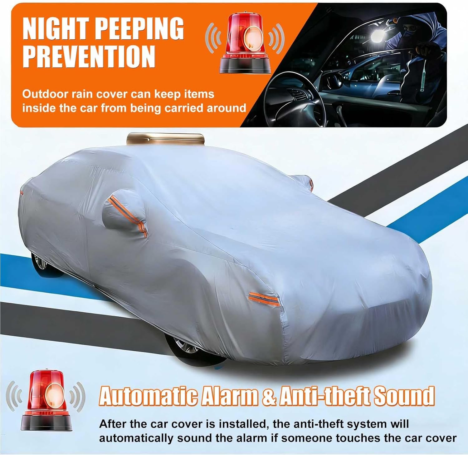 [Anti-theft Alarm]: When the cover is unfolded, the built-in anti-theft alarm automatically activates. If anyone touches or lifts the cover without authorization, a high-decibel alarm will be triggered immediately. It also features a windproof rope and lock for double protection. At night, high-brightness reflective strips clearly outline the car’s shape, alerting pedestrians and other vehicles to prevent scratches.