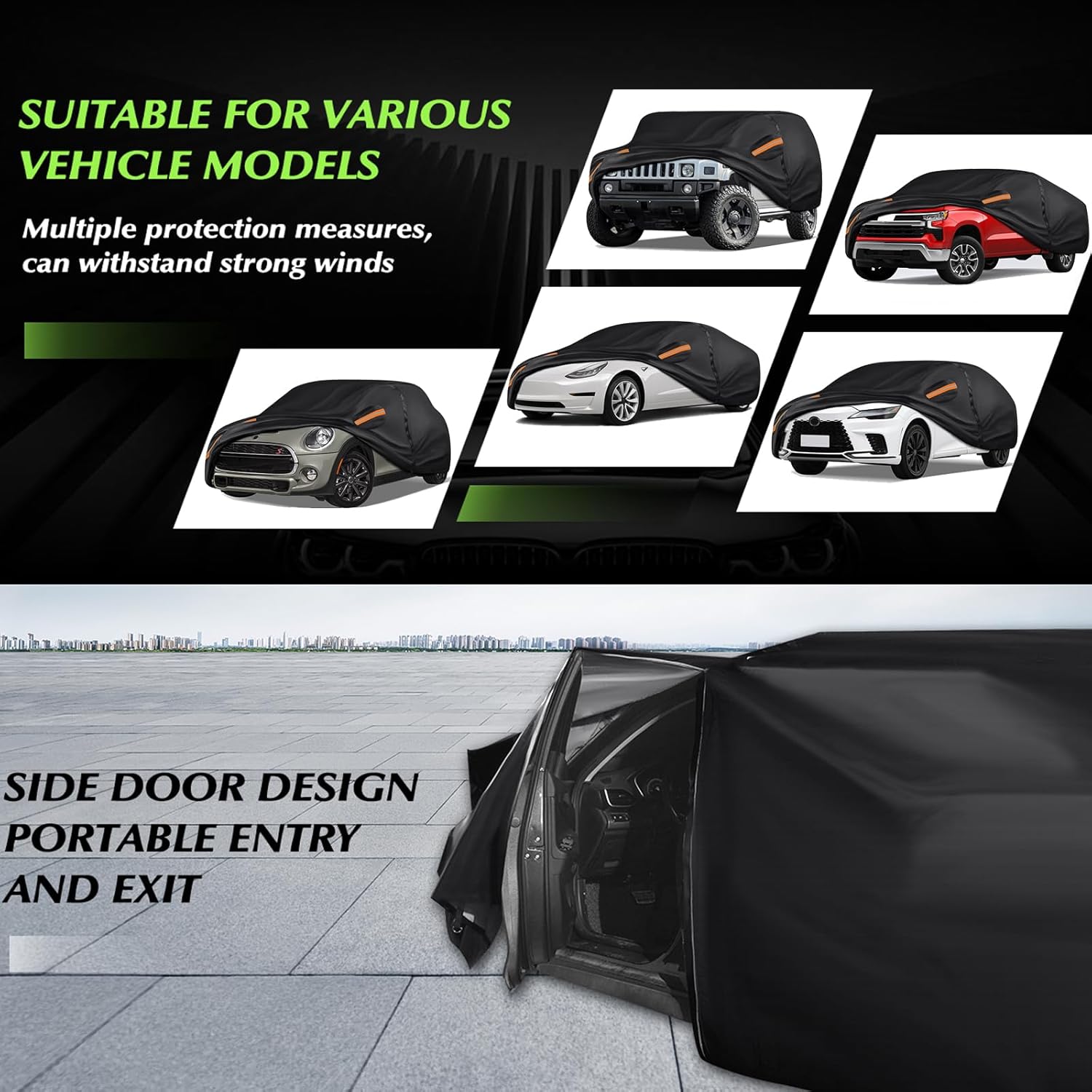 【PROFESSIONAL DESIGN】- ❶Driver door zipper for easy access. ❷Windproof straps at front & rear to fix your auto cover in heavy wind. ❸Two ultra long reflective strips at the front and rear, reminding others at night. ❹2 mirror pockets for optimal coverage.
