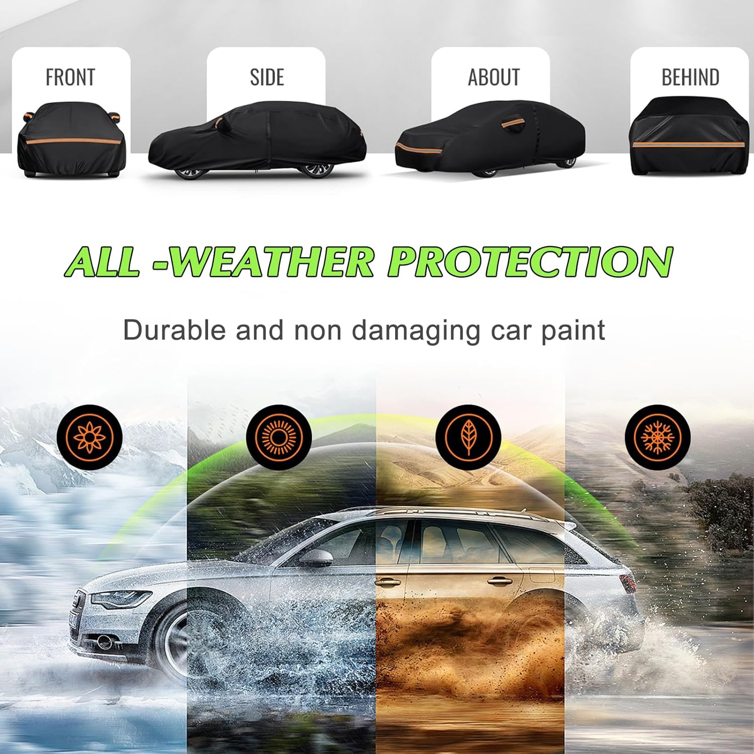 【PREMIUM MATERIAL】- ❶In summer, it can resist direct sunlight and has good sun protection and UV protection properties. ❷In winter, it can prevent snow and freezing rain from damaging cars, eliminating the risk of cars freezing. ❸The inner layer is made of thick and soft cotton to protect the vehicle paint surface, and the multi-layer material is thicker and more durable than other similar products.