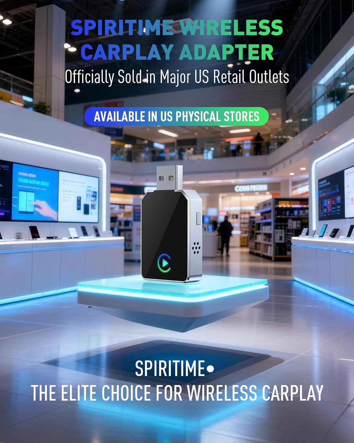 SPIRITIME Wireless CarPlay Adapter for iPhone – 5-Second Auto Connect | 1-Click Phone Swap for Families | Convert Wired to Wireless | Stable & Fast, Plug & Play | Supports Factory CarPlay Cars 2016+