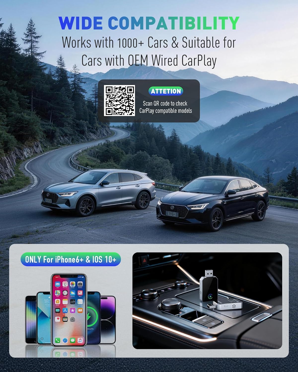 【5-Second Auto Connect – Just Plug & Play, No Complex Setup】: Get wireless freedom without the wait. Our advanced chipset enables a lightning-fast 5-second connection – just plug into your car’s USB port and drive. No apps to download, no confusing menus. Works seamlessly with all factory CarPlay vehicles (2016 and newer). Enjoy true plug-and-play convenience every time you start your car. Compatibility Note: Requires factory-installed wired CarPlay. If you’re unsure, you can contact the seller where you purchased your car, or search online to check whether your vehicle model comes with CarPlay built-in.