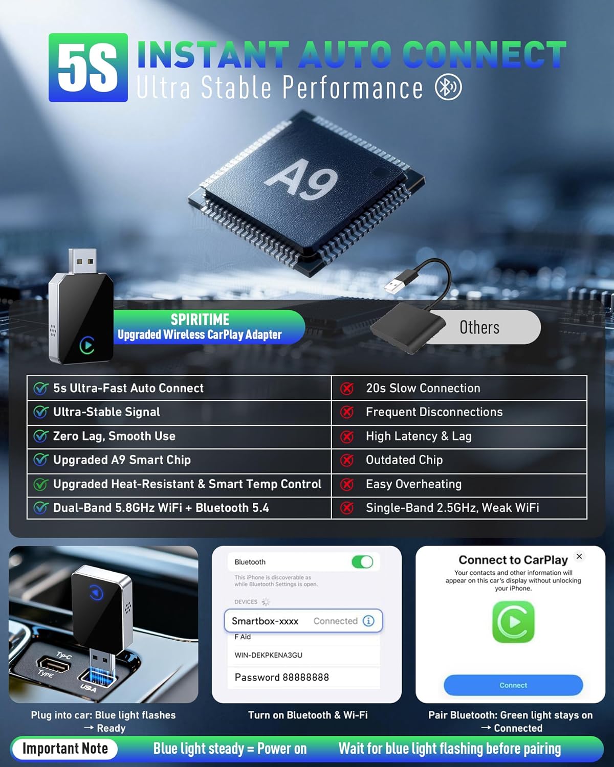 【Smart LED Light Control – Reduce Distraction, Enhance Driving Focus】: Annoyed by glowing adapter green lights near your dashboard screen? Simply press and hold the button for 5 seconds to turn off all LEDs, creating a cleaner, distraction-free cockpit. Safety meets simplicity. Restore the lights anytime with another long press. SPIRITIME Wireless CarPlay: The Spirit of Smart Driving!
