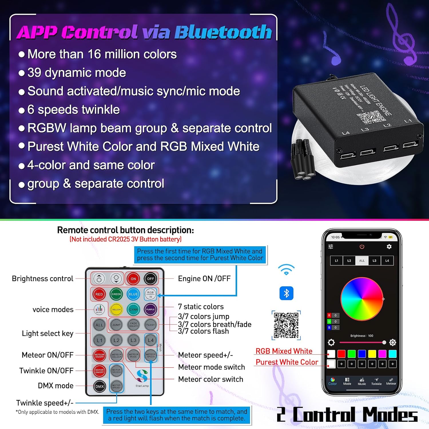 Scan the Bluetooth Controller QR+code, Download “StarLamp” APPTurn on APP Bluetooth.Find the corresponding, matching bluetoothTurn on the switch