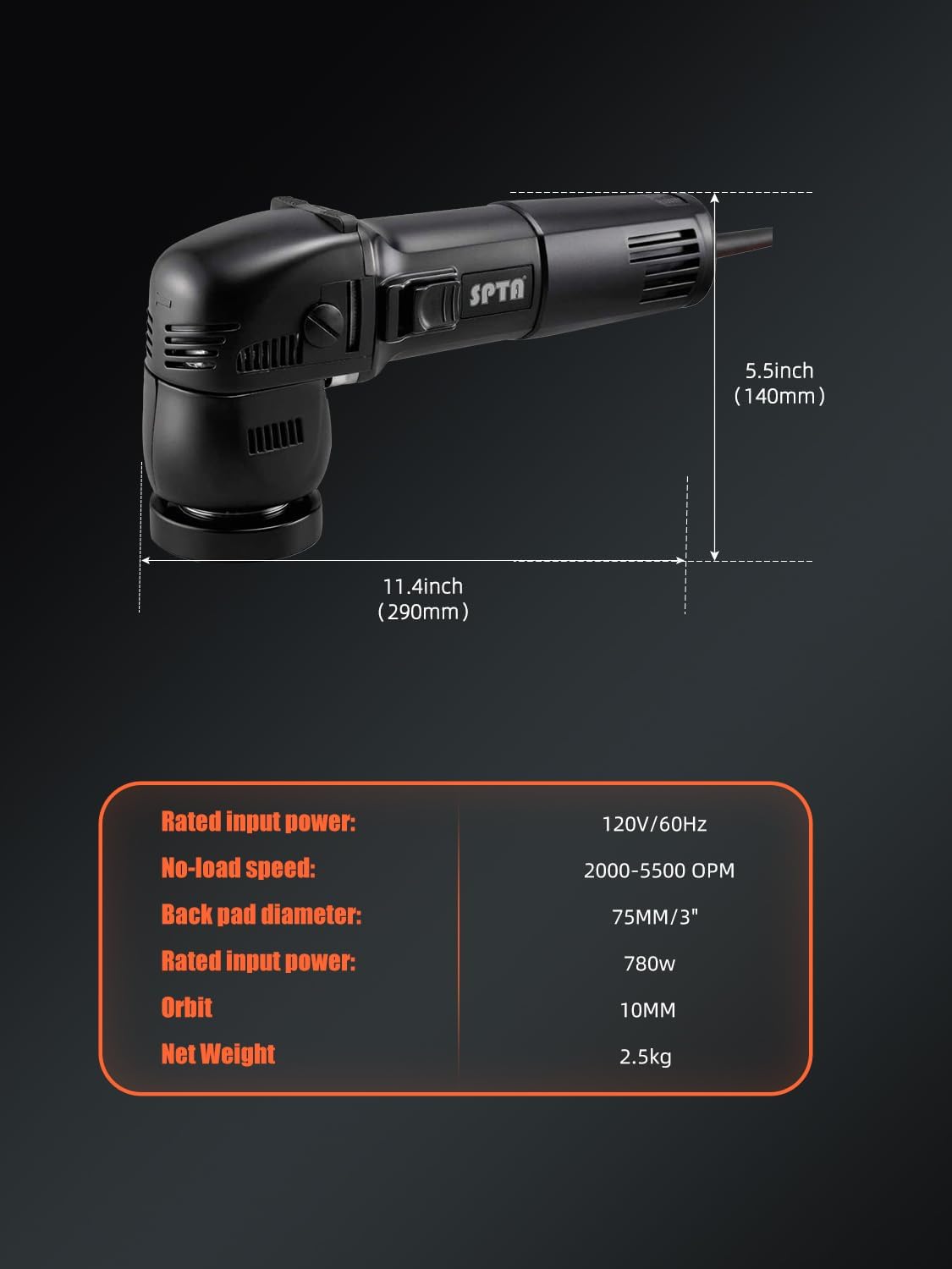 This item is a clone of a 12mm long throw DA polisher by Rupes, but with a 10mm throw instead. I would imagine they’re all built in the same factory overseas and rebranded by various distributors. It’s heavy and well built with a powerful motor. I think it has a throw somewhere between 8-10mm, as I’ve seen different specs listed for this type of tool on the internet and packaging, but this is still a good size stroke for a small DA tool, but falls short of the actual Rupes, which is a true 12mm long throw that will correct defects faster. I’ve put a few hours on this unit and it’s worked great, corrects well and finishes well. IMO having a small tool like this is very needed for doing edge-work, corners, concave/complex curves and tight areas. Foam pads included are actually quite good. I think it will hold up well.. Excellent value, given the MSRP of the tool it was designed to replicate. SPTA is becoming more of known brand out of China making good product for great prices. Overall quite happy and saved some major coin over the “real deal”. Perfect for an enthusiast, but if you’re a pro, I’d opt for the real thing (LHR 75e) for longevity and warranty work/support. I run this on speed 6 (max) when compounding to account for the fact that it has a shorter throw, but it cuts very well with course foam pads. I use speed 4 or 5 for finishing. It’s loud, so use ear protection.