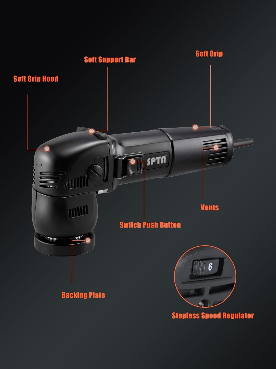 This is a GREAT value for a DA polisher. I have a Griots G9 6” DA and love it. Was going to buy Griots G8 3” DA to pair up with the larger unit. You really need both sizes to be able to get the smaller panel sections around the car. This SPTA compares well with the Griots, even better on more power and larger Orbital path. Has soft start and locking on switch. Maybe not as sexy as the griots but at literally half the price it’s a no brainer. Only issue I have is with the lock/start button, which for my hand is difficult to operate