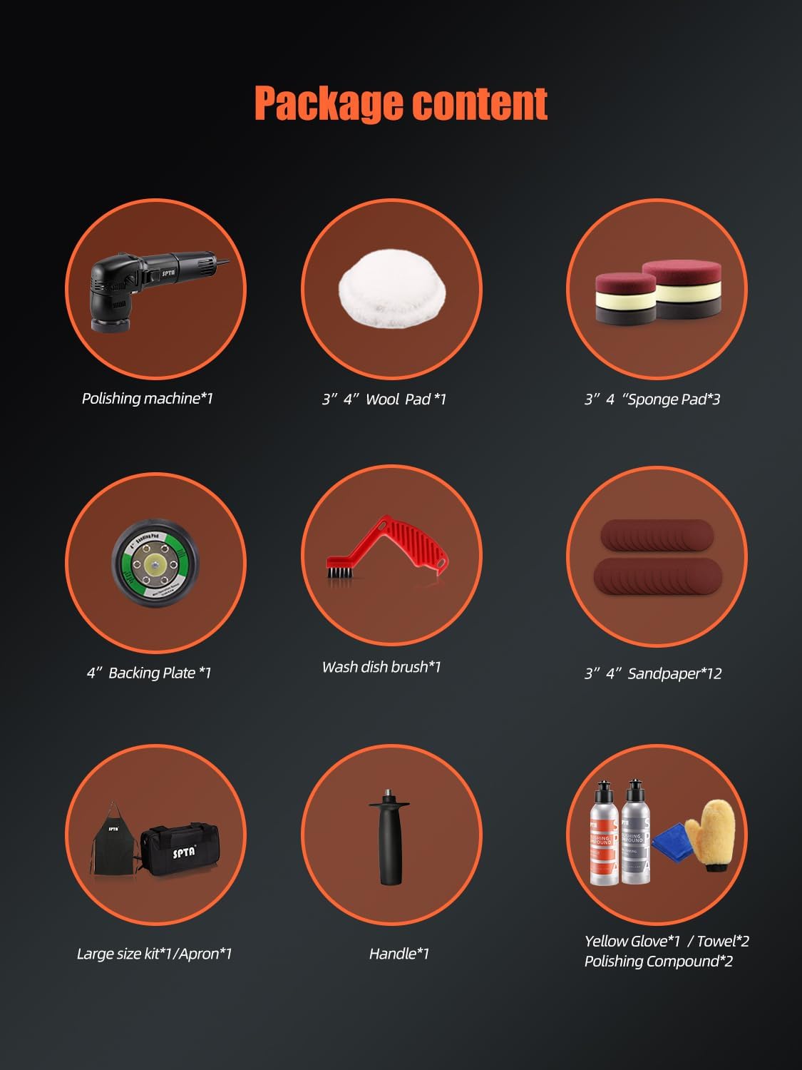 ◇What You Will Have◇ 1PC 3inch 10mm dual cation polisher, 3pcs 3inch&4inch polishing pads,1pc 3inch&4inch wool pads,2 bottles car scratch remover,1pc artificial cleaning glove,2pcs microfiber towel,1pc 4inch backing pad,1pc pad conditioning brush,12pcs 3inch&4inch sanding discs,1pc tool apron 1pc tool bag,1pc handle and our best service.