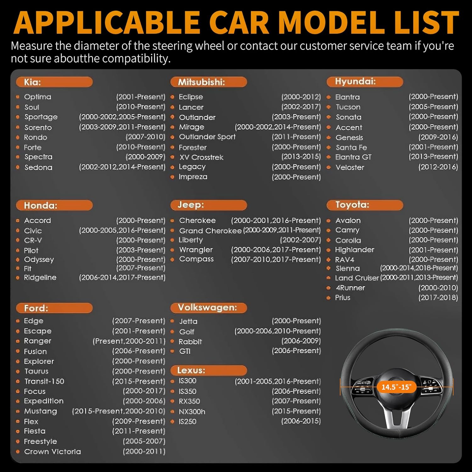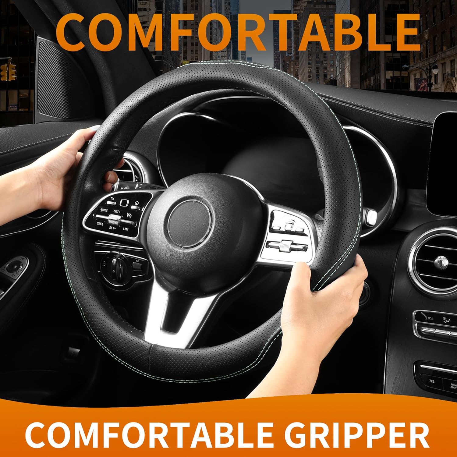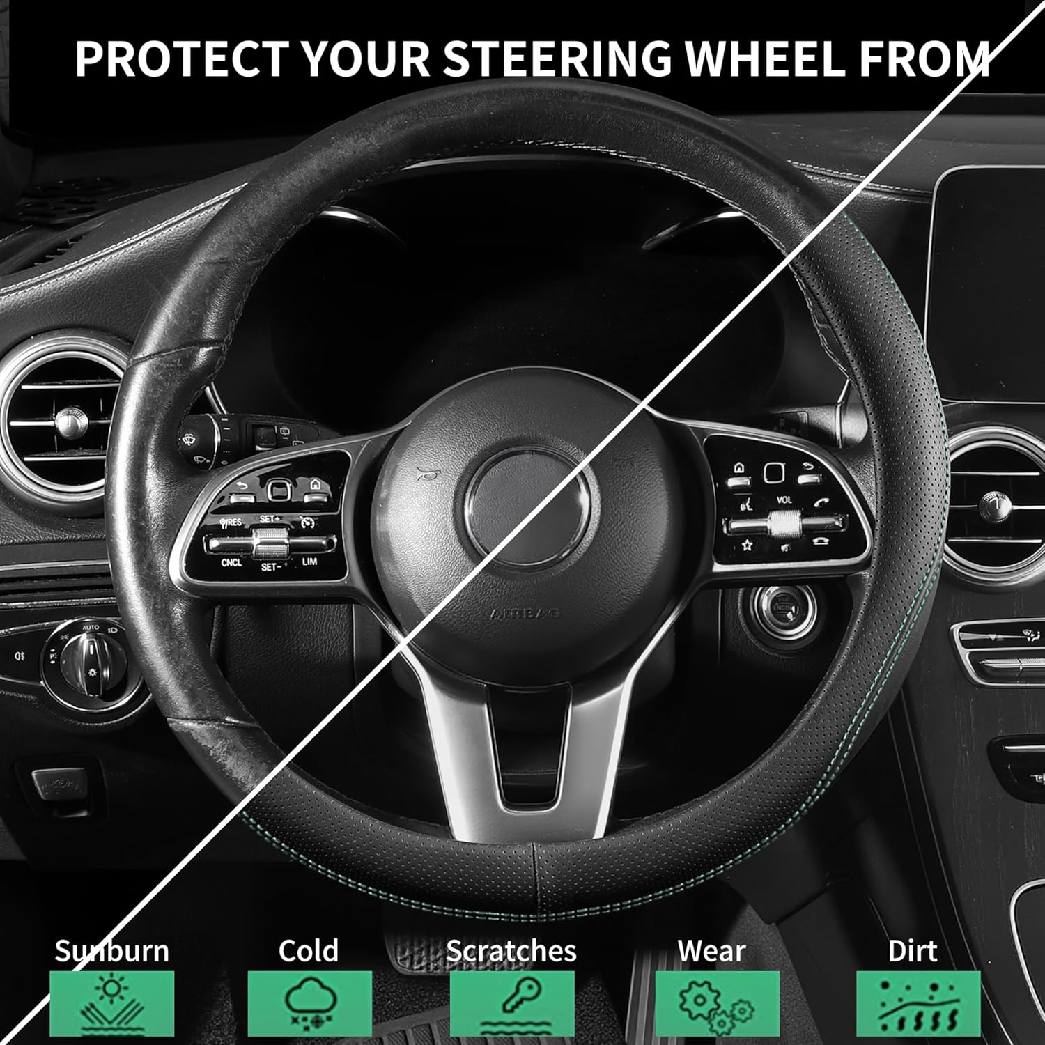 【Luxurious Feel】Enjoy the sophisticated look and feel of leather without the high cost. This cover is crafted from high-quality Faux Leather that is soft to the touch. The textured surface provides an exceptional, non-slip grip, ensuring total control and a comfortable drive in all weather conditions.