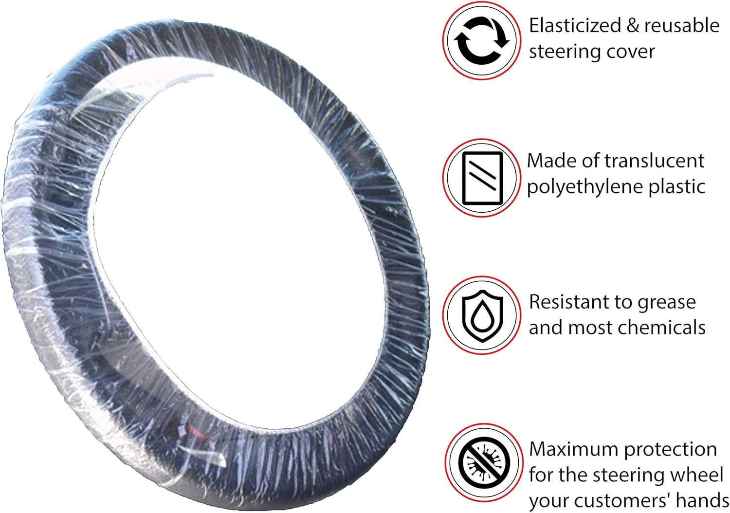Protect your customers and employees from grease, dirt, and germs!. These elasticized, reusable steering wheel covers are made of translucent polyethylene plastic. This special plastic is impervious to grease and most chemicals. The design of these covers offer maximum protection for the steering wheel and more importantly, your customers’ hands and gloves. Sold 100 per case.