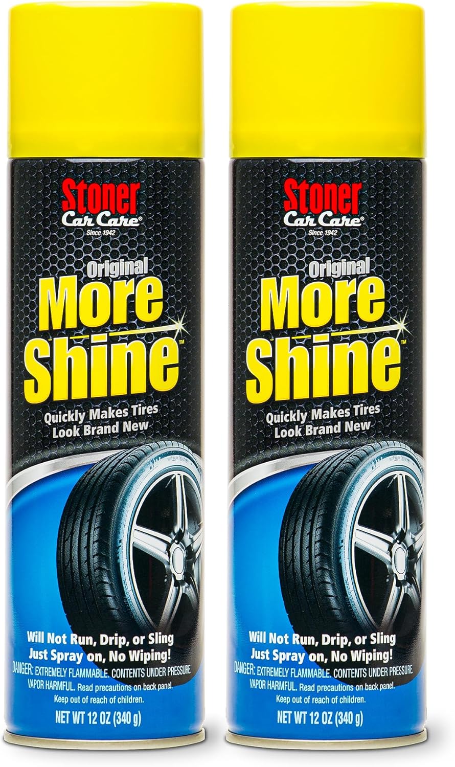 Stoner Car Care Original More Shine Tire Shine Spray and Tire Dressing is designed for drivers who want deep black tires without greasy residue or sling. This water-free aerosol formula restores the appearance of faded rubber while delivering a clean, controlled finish that dries to the touch. Unlike foam tire shine products or wet-look dressings that can drip, run, or attract dirt, More Shine Original sprays on evenly and stays in place. The non greasy formula helps reduce splatter onto paint and trim during driving, making it ideal for regular tire maintenance on daily driven vehicles. The long lasting, rain-resistant finish helps tires maintain their dark appearance through everyday driving and multiple rain showers. More Shine Original does not cause browning and helps protect rubber from UV exposure that can lead to fading over time. Application is fast and simple. Spray a light, even coating onto clean, dry tire sidewalls from eight to ten inches away. No wiping or buffing is required. Allow the product to absorb and dry fully before driving, and remove any overspray from nearby surfaces with a microfiber towel. For best results, apply in the shade to cool tires. Do not use on motorcycles or on pedals, steering wheels, or other control surfaces. Not for sale in CA, NV, UT, or AZ.