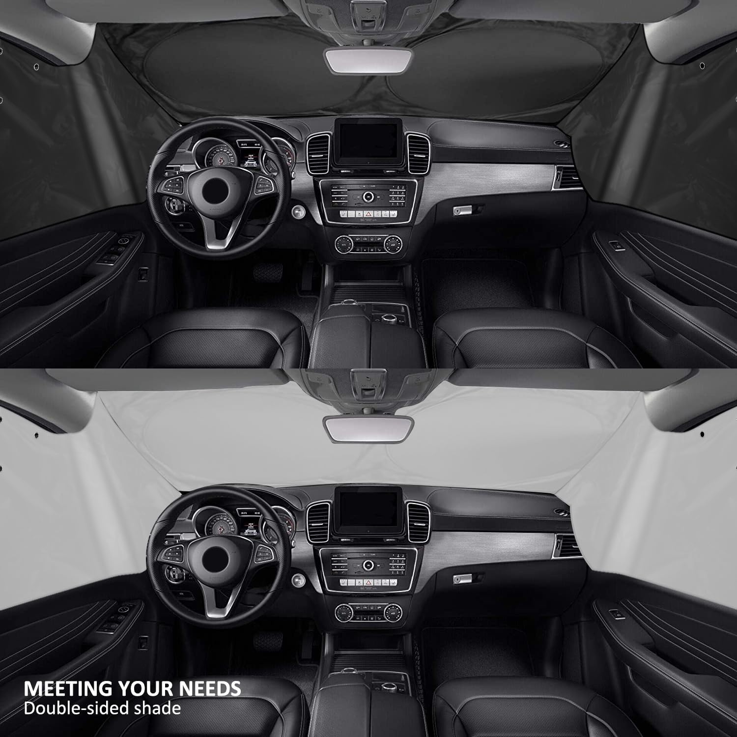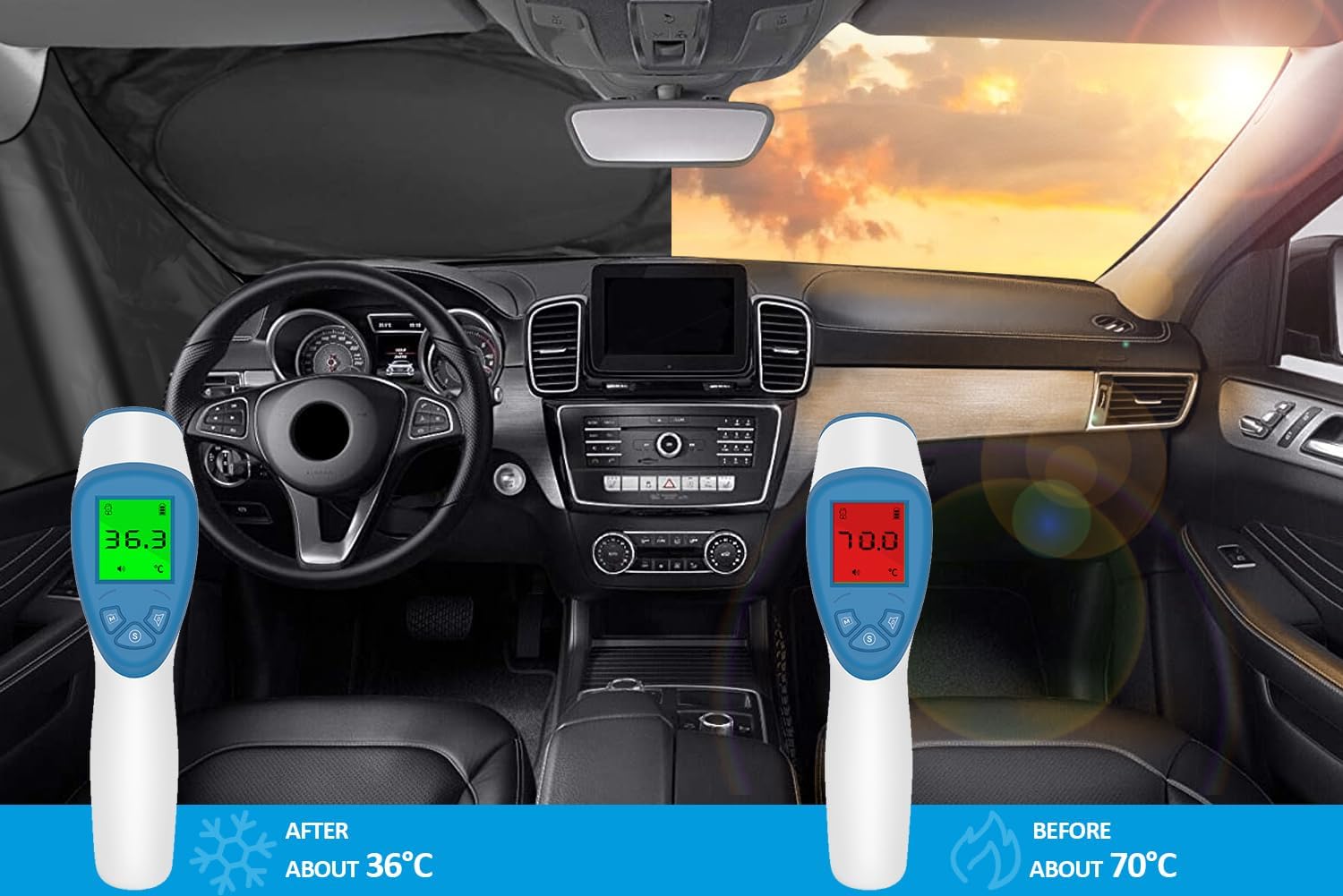 【Make Sure Your Vehicle Is Ready For Hot Summer Days】While a car is parked, heat and UV rays combine to put a beating on interior components. Dashboards and leather upholstery become dry and discolored. Neyyuse windshield sun shade protects your interior from harmful UV rays. Its Quality Silver Reflective material significantly reduces interior temperatures by as much as 80 degrees Fahrenheit.
