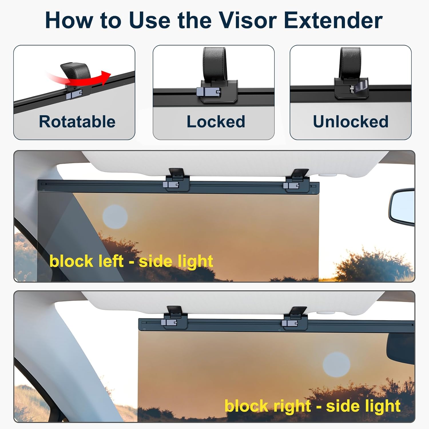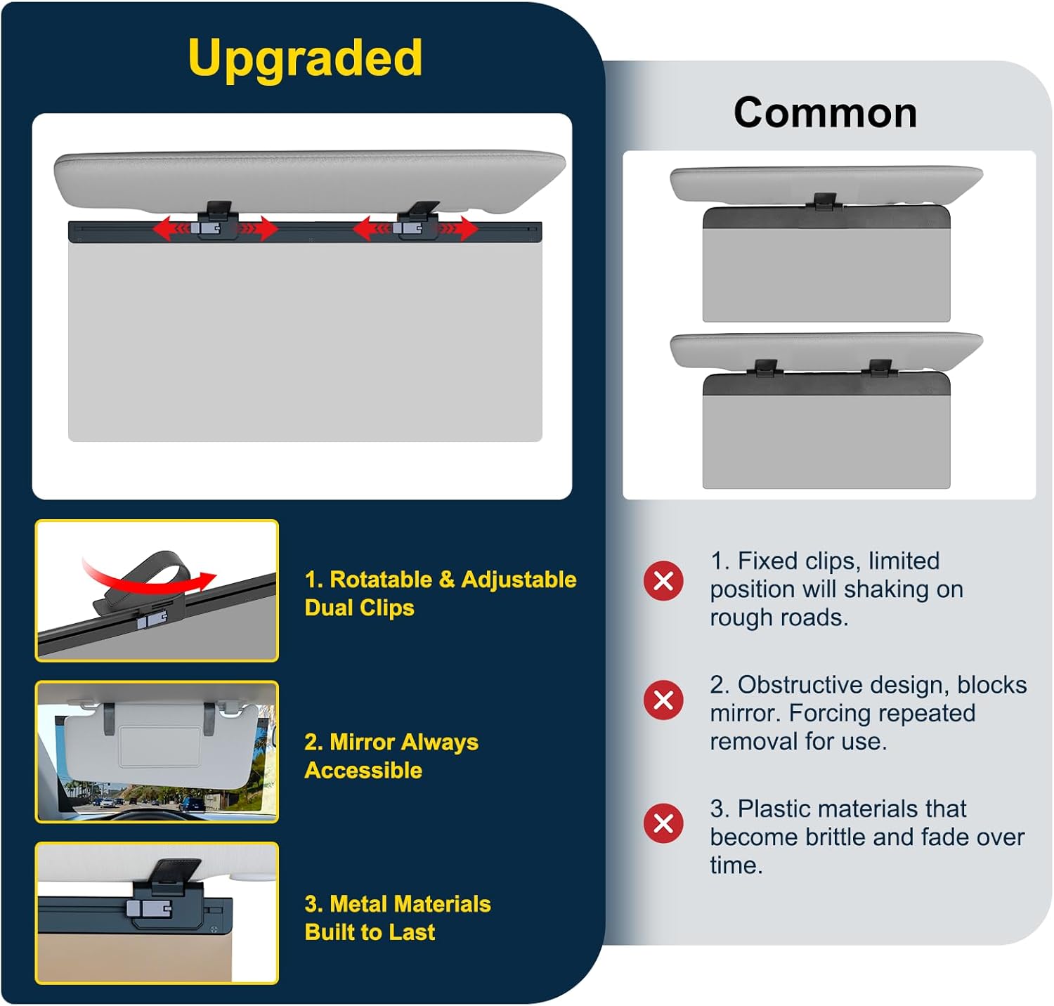 【Adjustable Dual-Clip, No Mirror Blocking】 Upgrade from single-clip and fixed-clip, our sun visor extender for car with dual clips features 540° swivel and slide adjustment. This adjustable car sun visor extender lets you position it perfectly to block glare while keeping your vanity mirror fully accessible—a critical advantage over single-clip designs that often block the mirror.