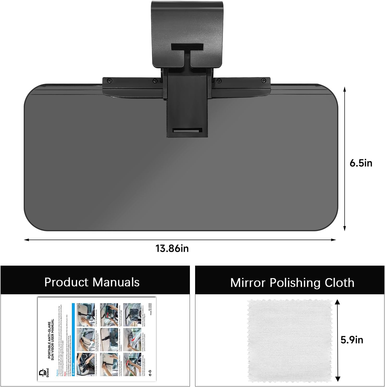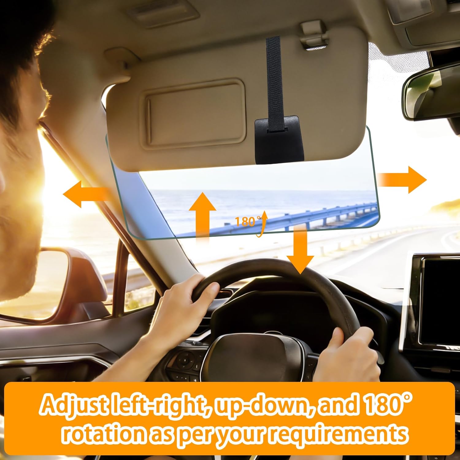 【New Design】:Unlike other single-layer PC or acrylic materials, double-layer PC has anti-bending properties.Double-layer PC material makes your vision better, 2mm mirror thickness is stronger to resist bending,day and night anti-glare polarized car sun visor extender.Withstands -30°C to 120°C extremes, featuring scratch-resistant crystal clarity for sustained aesthetic appeal and reliability.