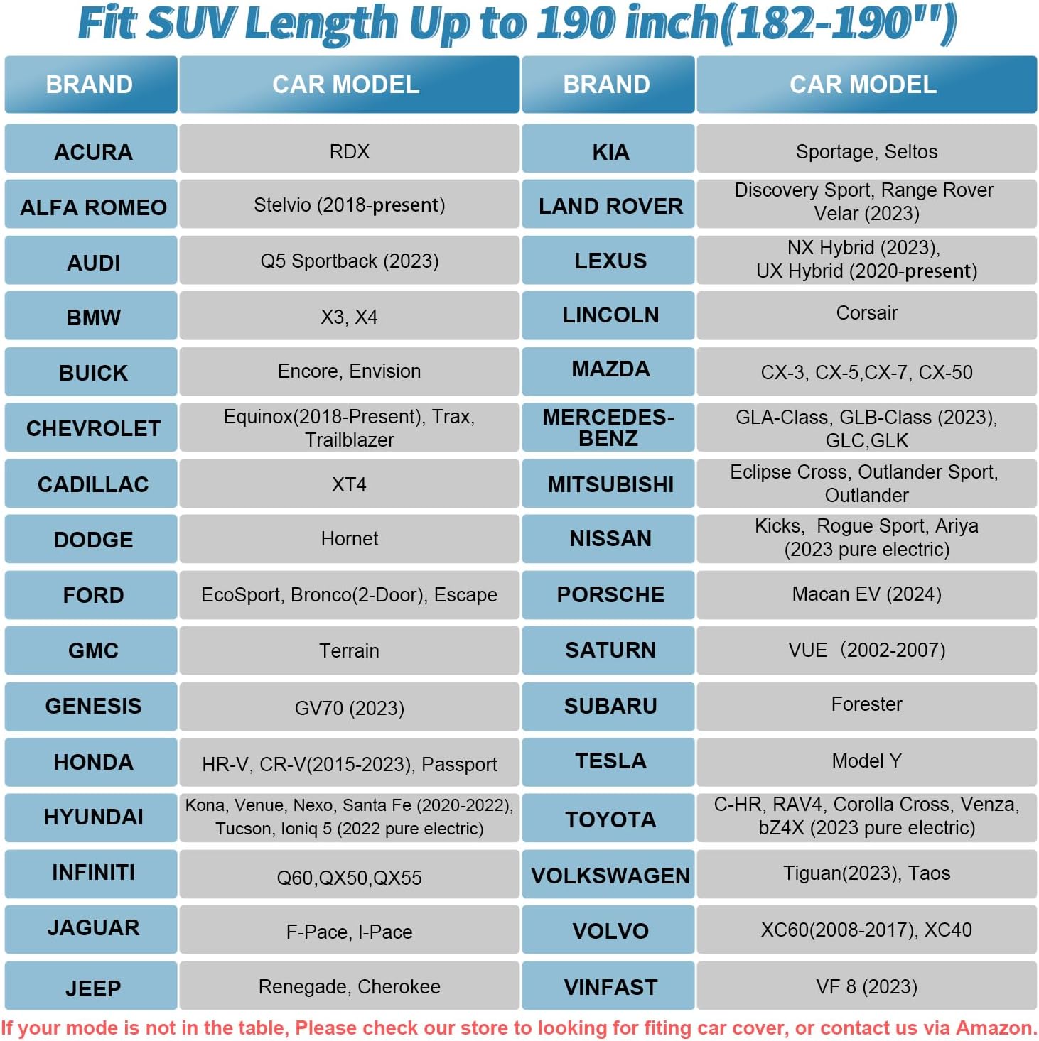 Universal Custom Fit: Designed to accommodate a broad range of SUV sizes with dimensions of 191x75x73 inches (485x190x185 cm), our car cover ensures a perfect fit for most SUV models, including the Toyota Highlander, Honda Pilot, and many more. For exact matches, refer to the vehicle list provided in the images section, or use our detailed sizing guide to measure your SUV, guaranteeing a flawless fit and optimal protection for those searching for universal car cover or car cover suv