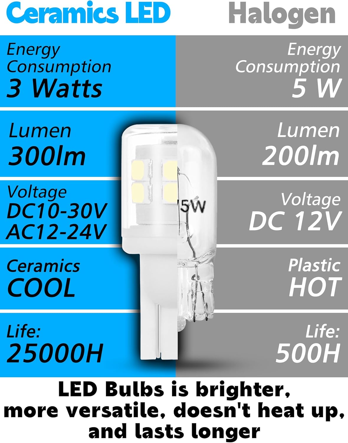 Super Bright 6000k White Light: 194 LED bulb has 14 high quality brighter SMD 2835 LED beads, consuming only 3w to provide 300 lumens of clear 6000K cool white light. Say goodbye to dim lighting, these 168 LED bulbs outperform standard halogens by 200%, perfect for lighting up the interior of your car without glare. With wide voltage AC10 to 18V or DC10 to 30V, more stable and flicker-free
