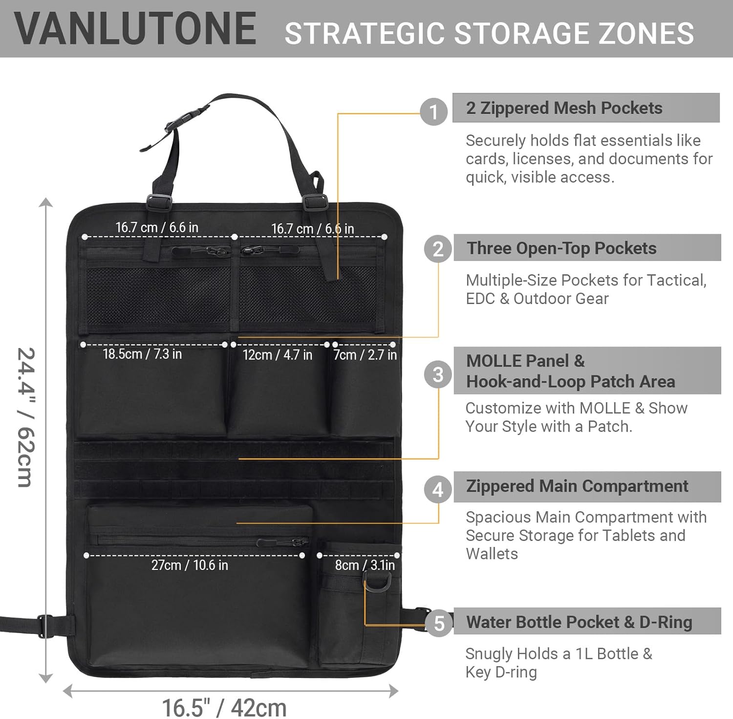 ALL-IN-ONE TACTICAL STORAGE, DECLUTTER YOUR SPACE: This tactical car seat organizer features multiple large compartments, a built-in cup holder, and a full-length MOLLE panel system. Ideal for holding everything from MOLLE-compatible pouches and tools to daily essentials, it efficiently transforms your chaotic back seat into a neatly organized space.