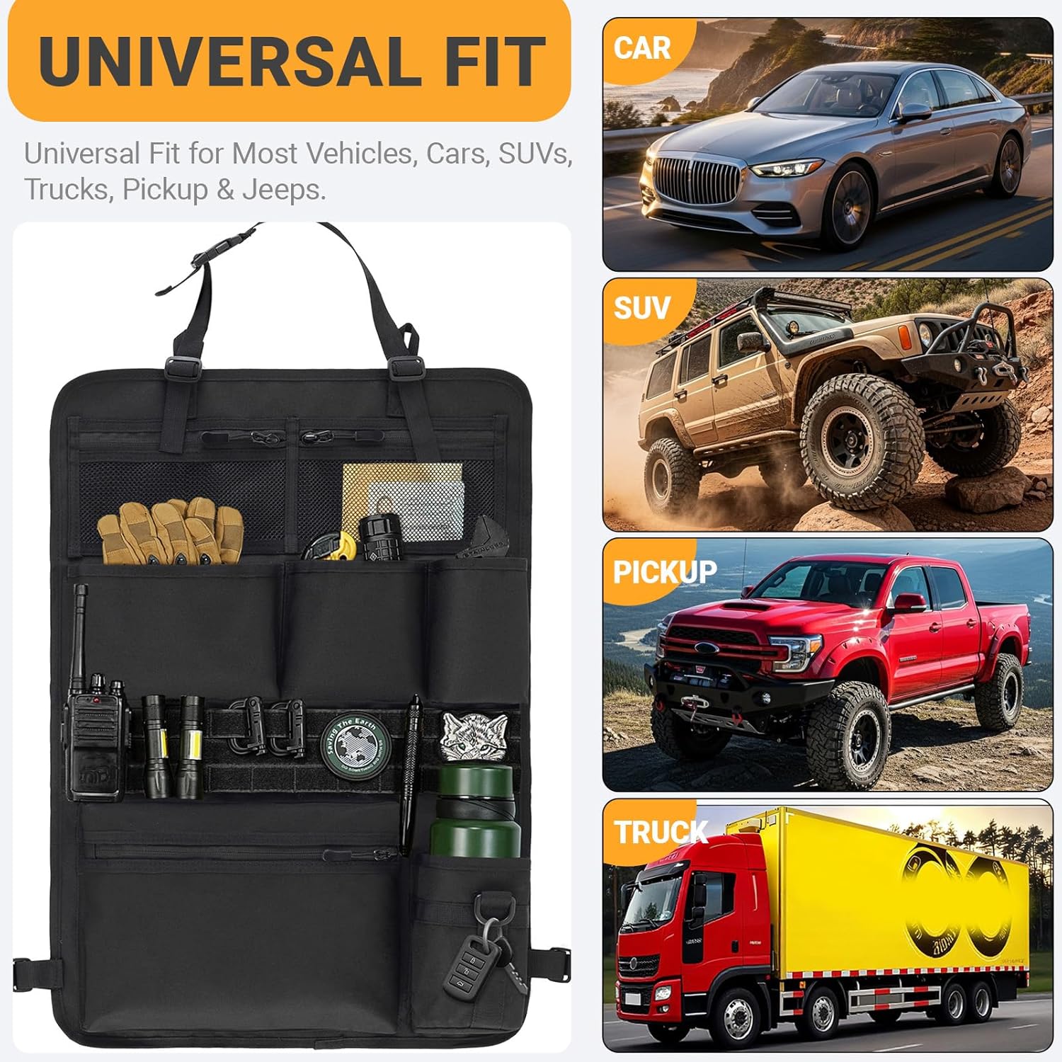 UNIVERSAL FIT FOR MOST VEHICLES, TOOL-FREE INSTALLATION IN SECONDS: Designed with adjustable straps and robust buckles, this MOLLE car seat organizer secures easily to the back of most car, SUV, and truck seats (including Ford, Jeep, etc.). Simply buckle the adjustable straps around the headrest posts and secure them at the seat base.