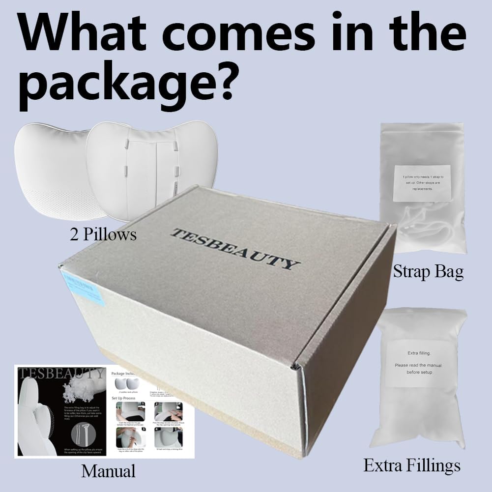 Package includes—-2 leather Tesla headrest pillows, 2 elastic attachment straps, 1 extra filling bag, and 1 piece of user manual. Also extra 2 straps are provided in the bag as replacements. One pillow only needs one strap to set it up, but you could use 2 straps to set up 1 pillow in order to make the pillow more tightly attached onto your headrest. But 1 strap to set up 1 pillow usually meets your needs.