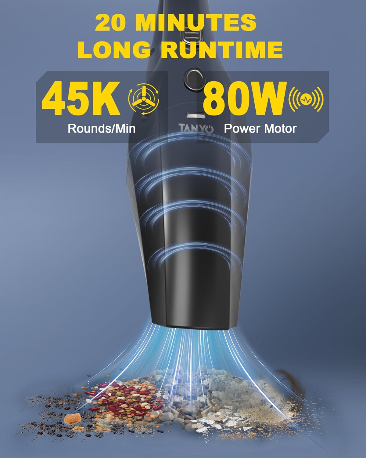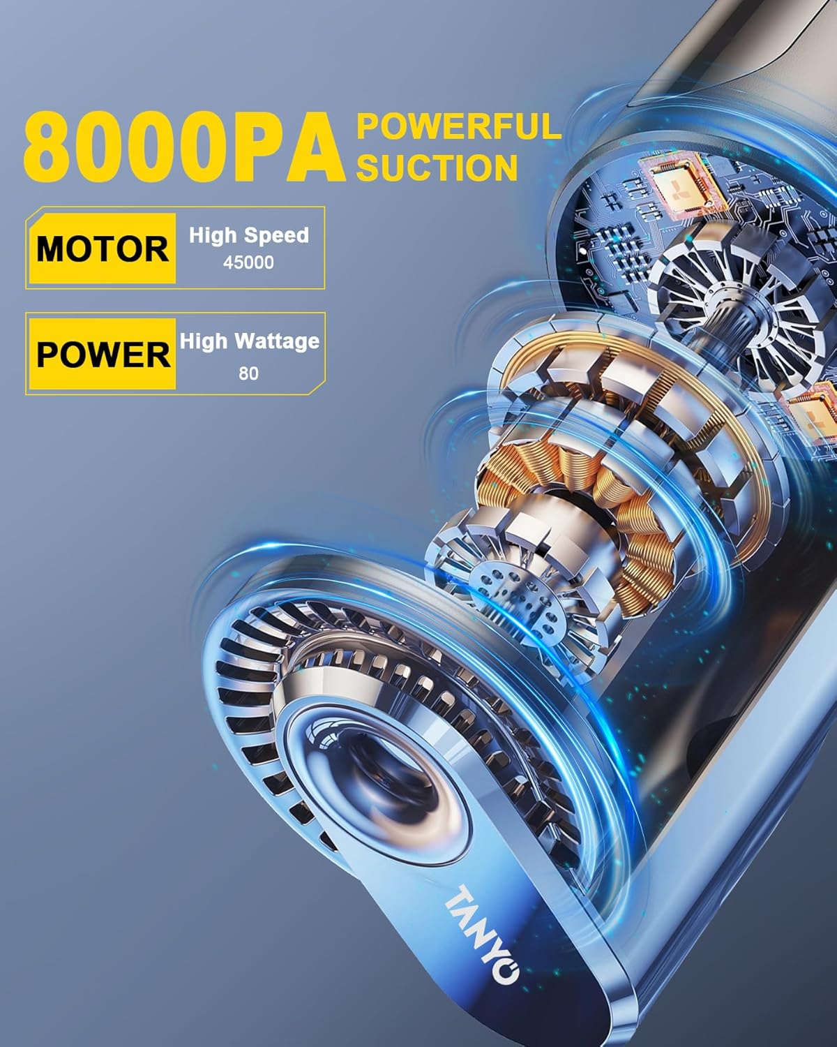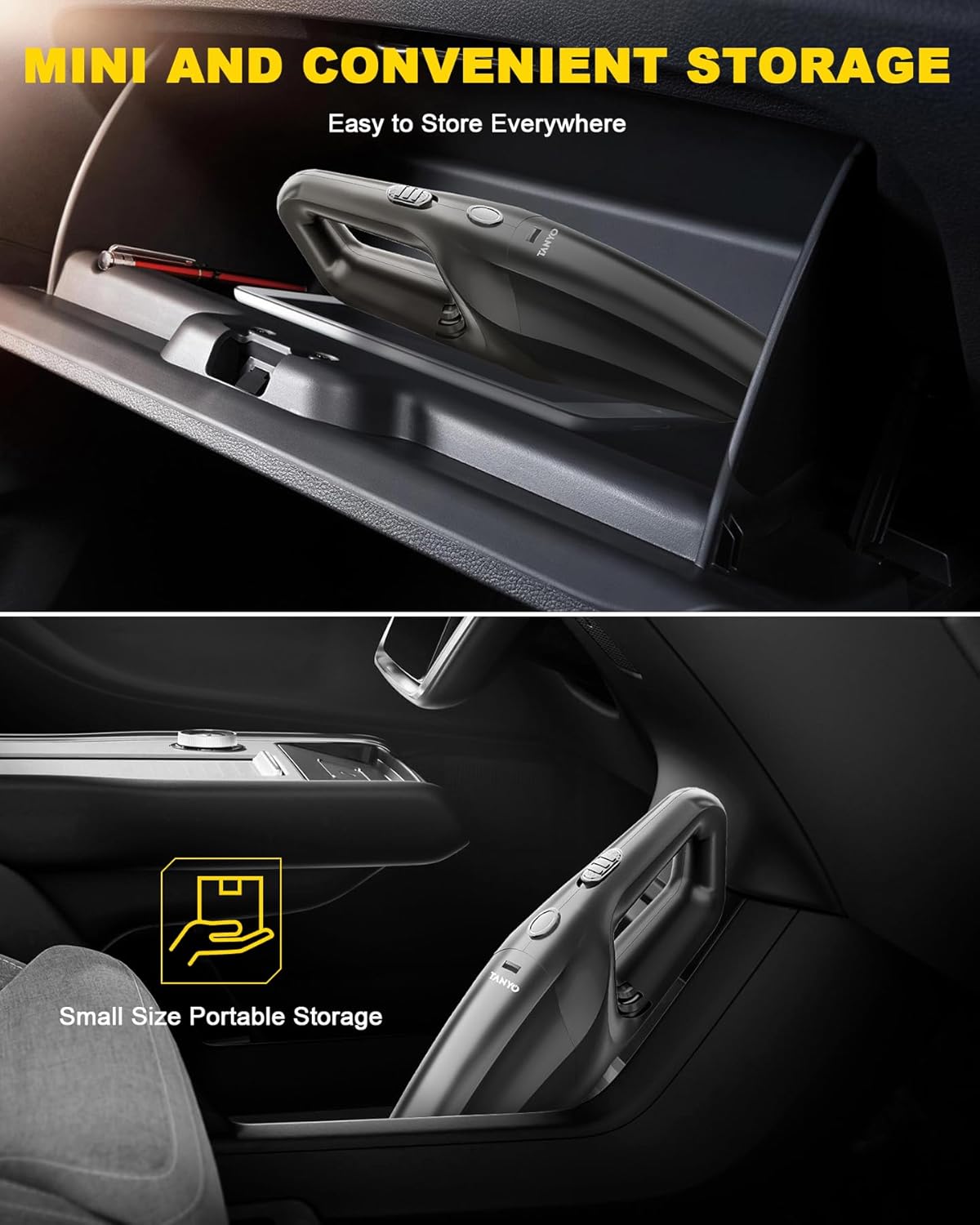 8000PA POWERFUL SUCTION: Car Vacuum features an improved motor with suction power of up to 8000PA, not only does it extend the life of the handheld vacuum cleaner, but it also minimizes noise and disturbance to others.. Extra powerful motor and long battery life helps you to do a complete cleaning. Quickly removes dust, debris, dog hair, dirt, sand or crumbs.