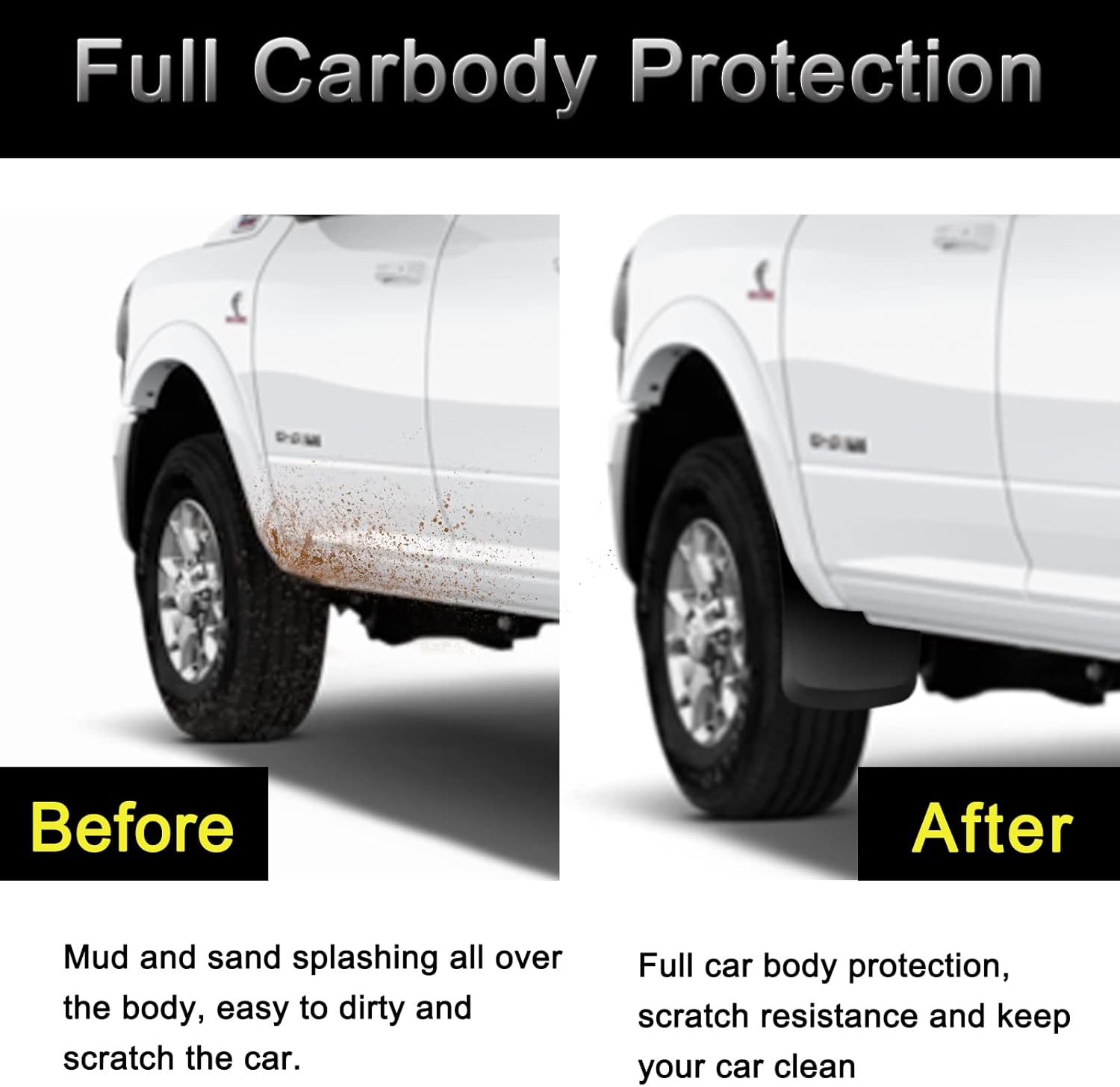 Thickening and Durable: Thickening design for off-road driving with impact strength up to 10 MPa, and tenacity additive keep the splash guards from deforming. These heavy duty solid mud flap protect your vehicle from mud, dirt, ice, gravel and road salt. Keep your vehicle clean and avoid frequent washing