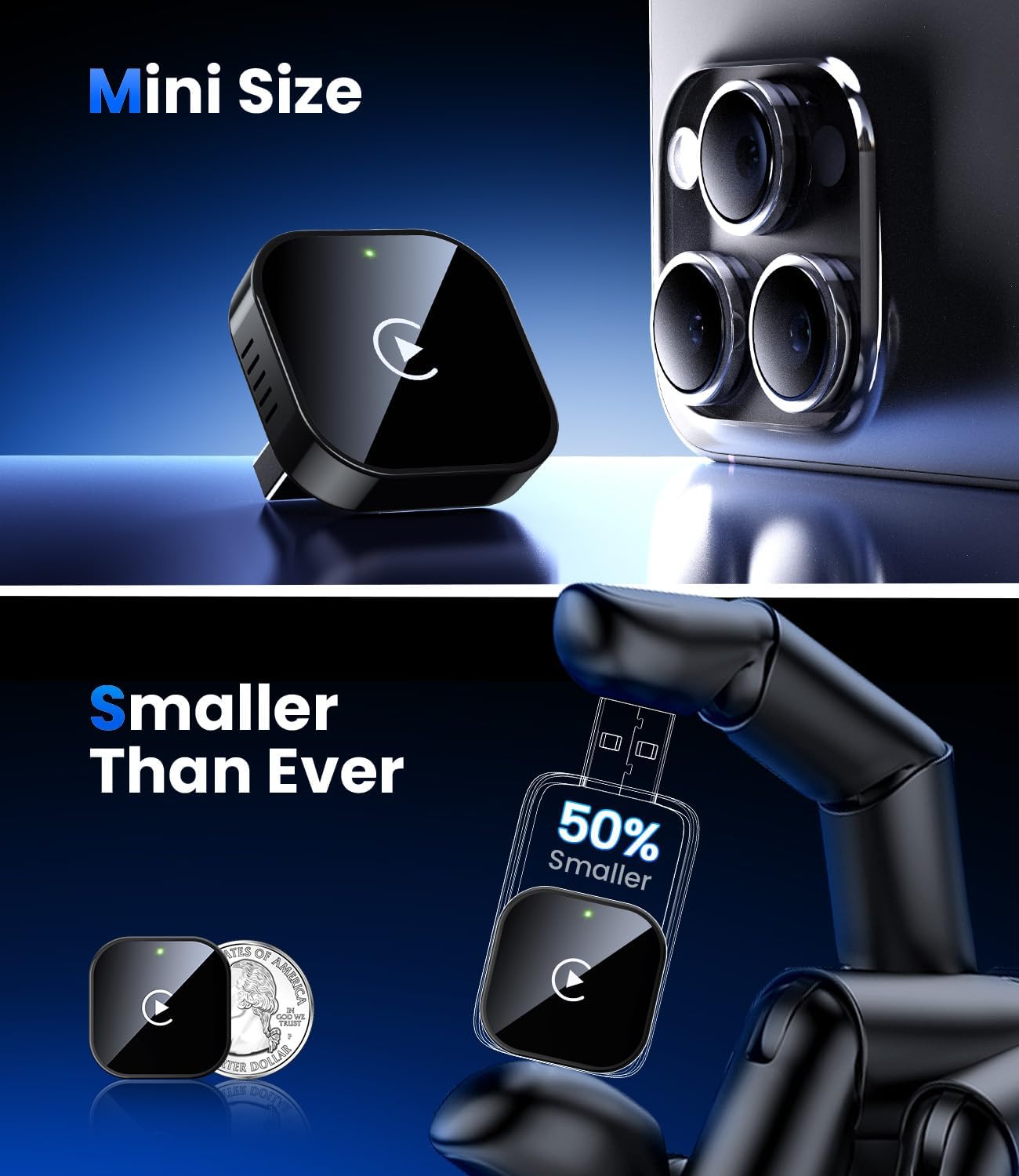 ✅ Ultra-Compact Mini Design (50% Smaller) – Sleek, cube-style wireless CarPlay adapter fits nearly flush with your car’s USB port for a clean, clutter-free interior. No dangling cables or bulky boxes — just seamless wireless CarPlay integration.