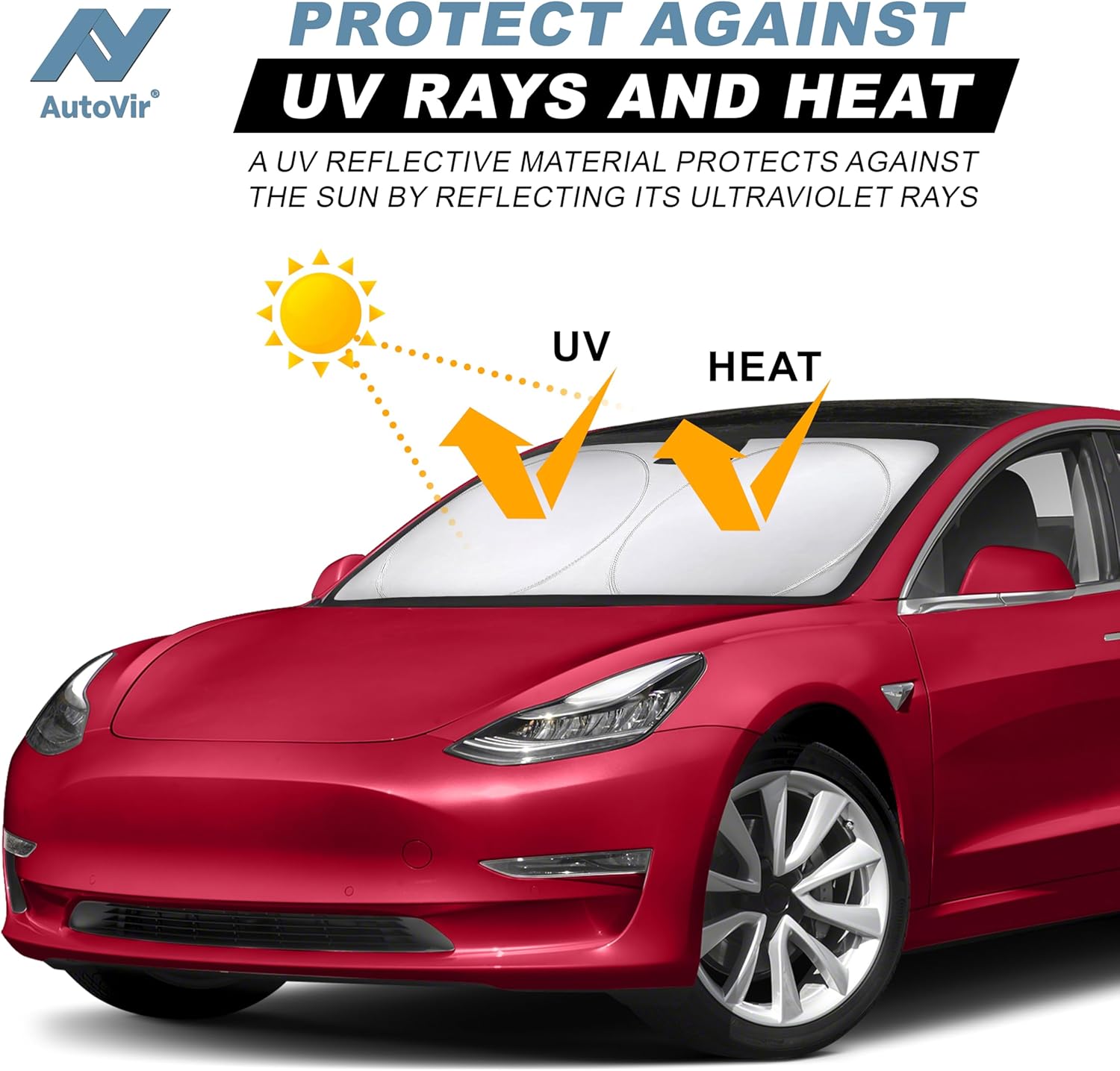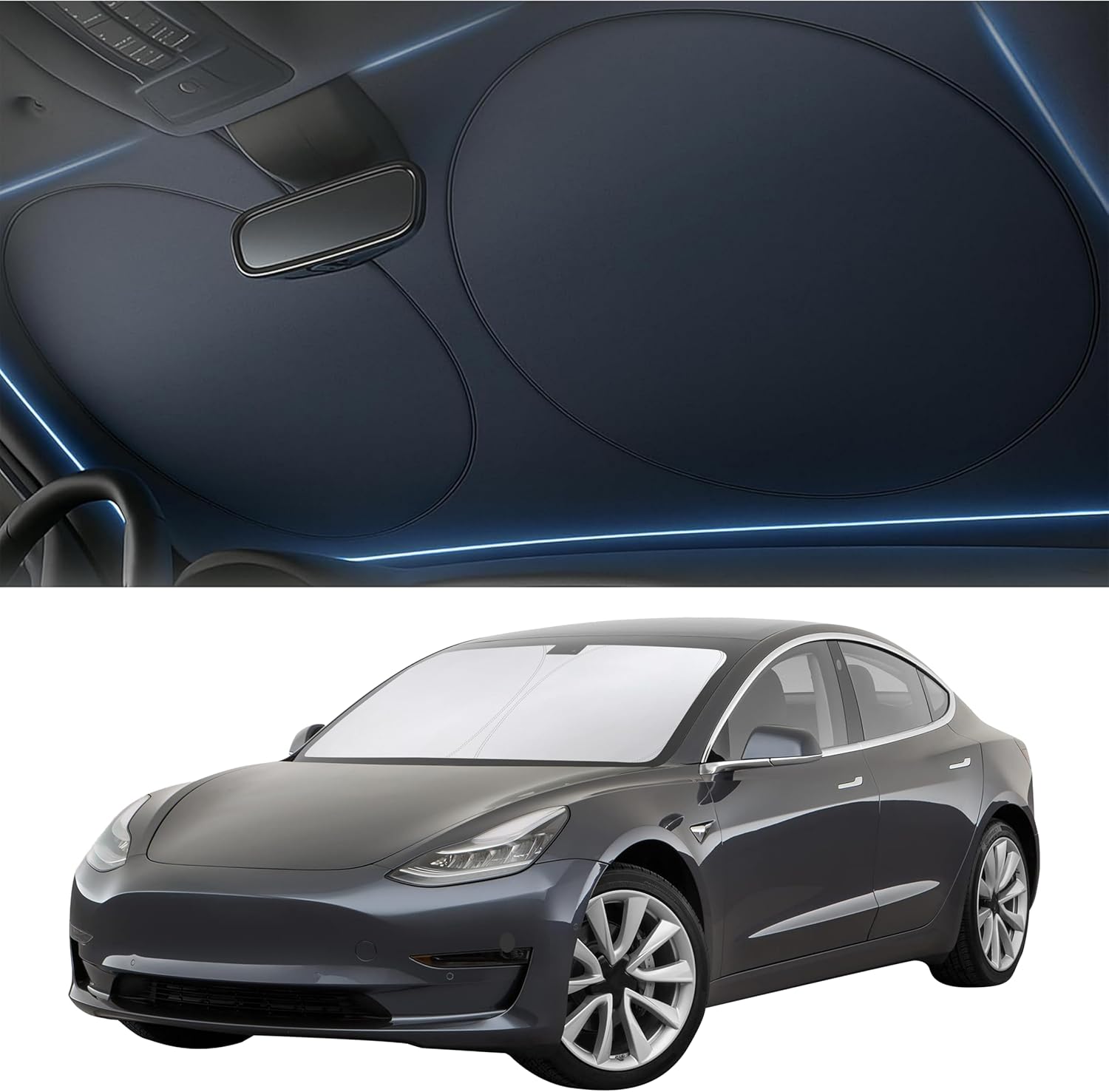 Custom Fit for Tesla Model 3 & Model Y Windshield : Precision-engineered for Tesla Model 3 and Model Y, this windshield sunshade (56″ x 36″) ensures maximum coverage, effectively blocking direct sunlight, reducing glare, and maintaining a cooler cabin temperature.