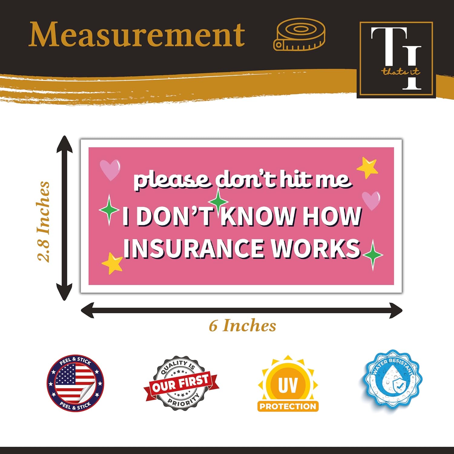 𝗣𝗥𝗘𝗠𝗜𝗨𝗠 𝗤𝗨𝗔𝗟𝗜𝗧𝗬 𝗦𝗧𝗜𝗖𝗞𝗘𝗥: Please Dont Hit Me I Dont Know How Insurance Works car stickers are made to withstand the harshest conditions outdoors. Safe and Non-toxic, Waterproof Snow defense and Anti-sun, Glossy, Bright, thick, and long lasting. You can be pasted repeatedly and there won’t be any residues. You can show your personality with these bumper stickers.