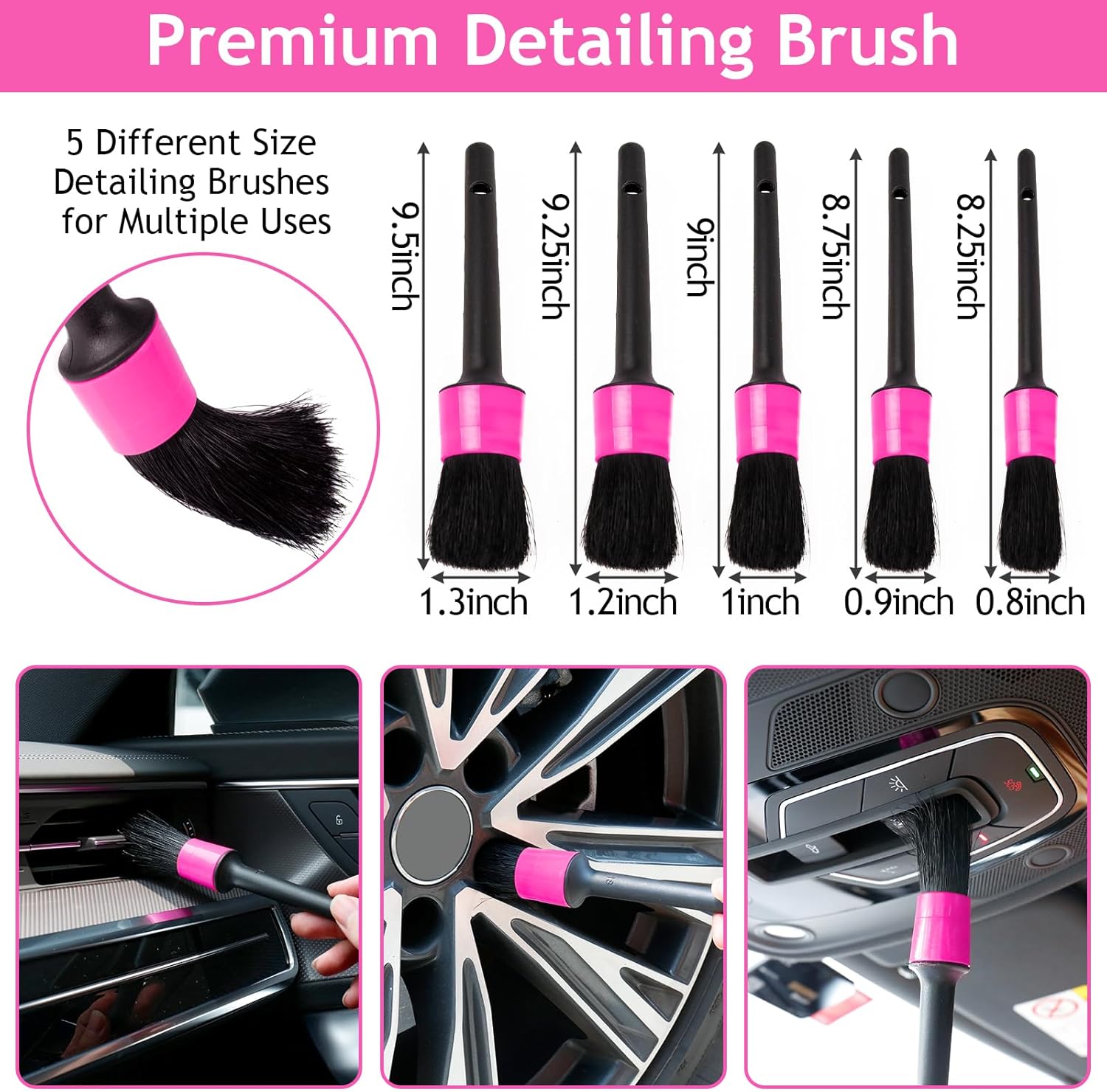 VARIOUS SIZE DETAIL BRUSH: 5 Different sizes of premium detail brushes, to ensure that can meet your needs, easily explore narrow spaces and while ensure that your car will not be hurt, great for wet and dry use, make your loved car fully tidy and clean from the inside out.