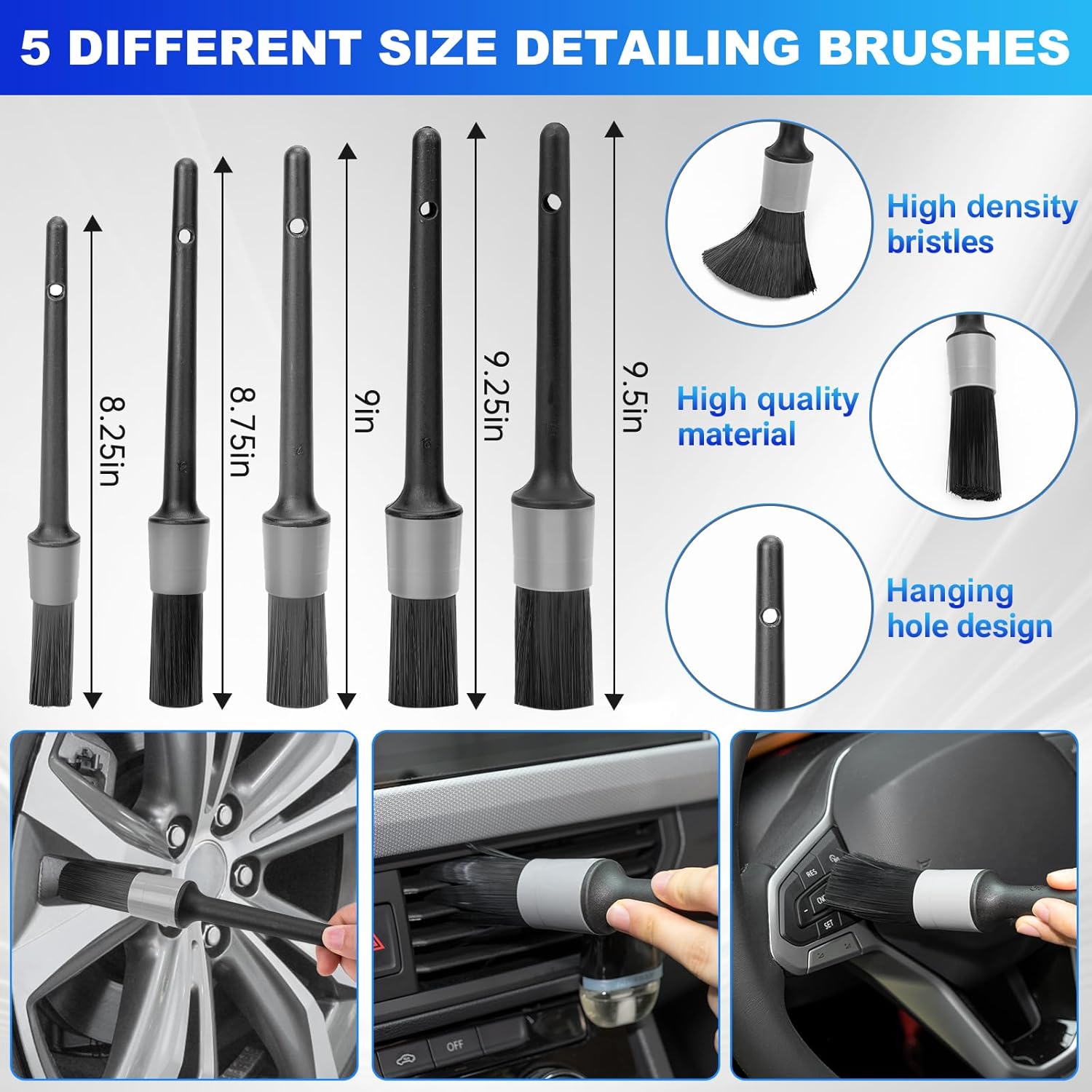 5 Size Detailing Brush Set: 5 different sized detailing brushes tackle any cleaning need as the perfect interior cleaner companion. Small brushes reach tight spaces, cracks, and wheel nuts. Large brushes efficiently clean wheels, seats, dashboards, and engine bays. Keep your car clean inside and out with this versatile interior cleaner brush set. Brush bristles use high-density fiber, no shedding, no scratching.