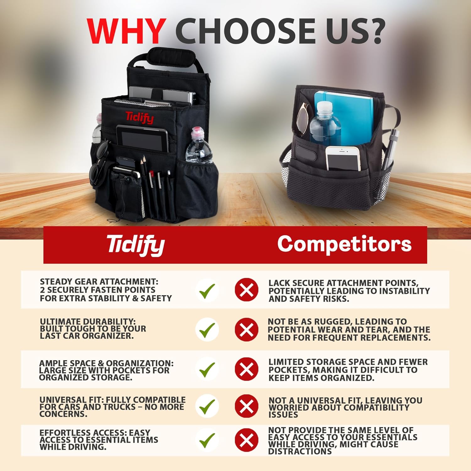 The problem with standard automobile storage space is that it’s tailor made for big items and is spread over the entire vehicle in a way that makes easy access almost impossible. With TIDIFY front seat multi-pocket organizer you can access everything you need in one, organized place and avoid having to repeatedly search for missing items on the floor, center console, or in the gloves compartment.