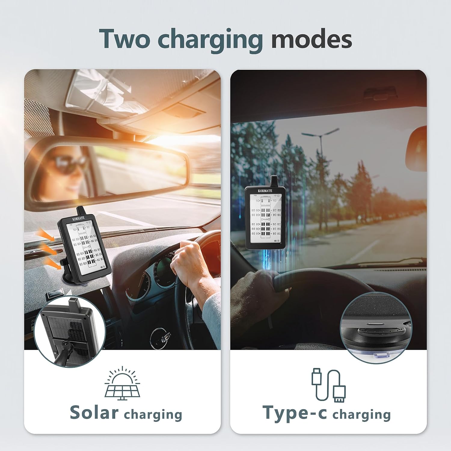 🚛 Large Vertical LCD display,All tires display simultaneously, Supports Type-C cable and solar charging, It can be fast-charged without occupying the car cigarette lighter socket,The monitor automatically sleeps/wakes up by movement detection or you may wake it up by press the buttons.solar system model.