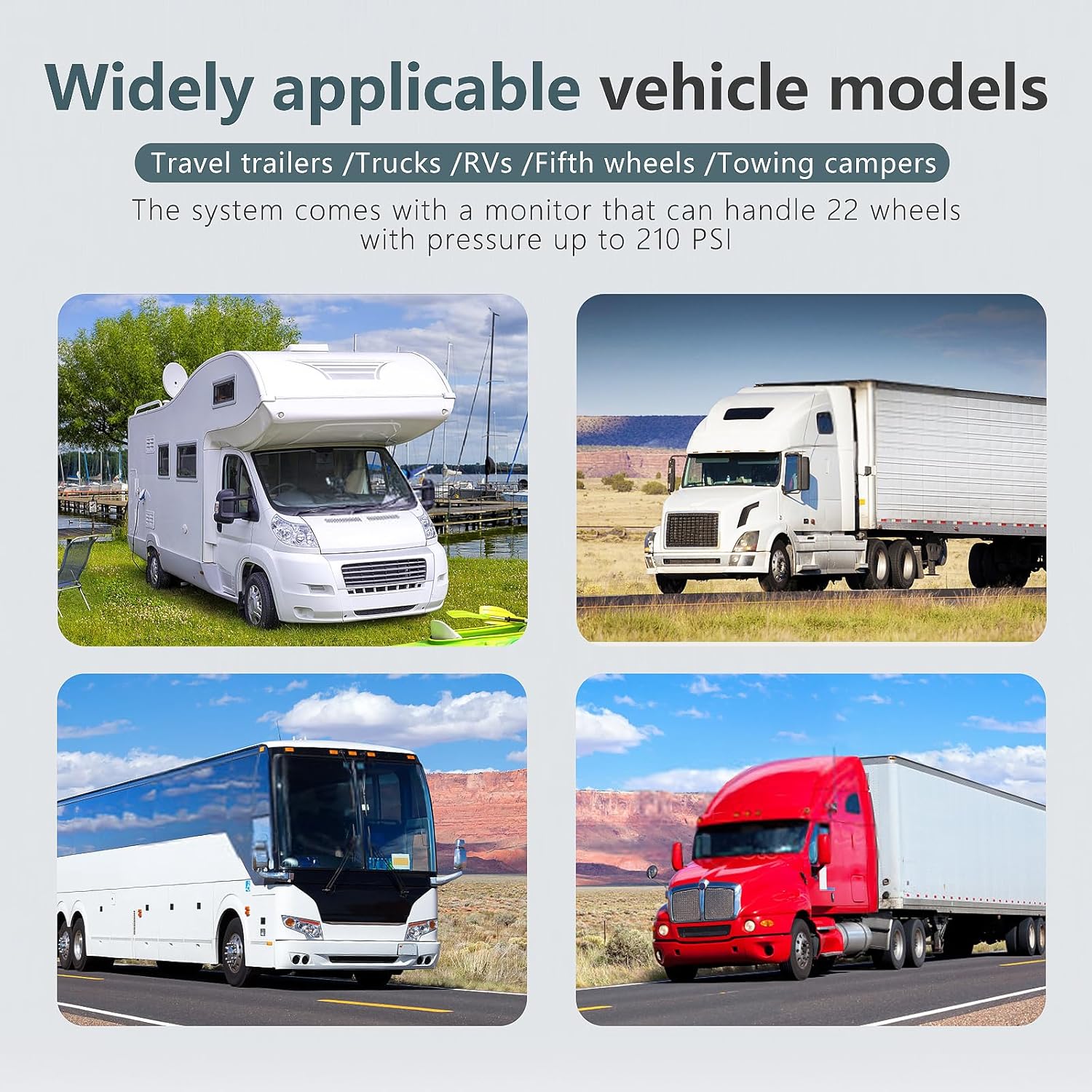 🚛 Advance Tech Alert system-the system is motion sensitive and monitors tire pressure and temperature on 6-second intervals continuously. It sends visual and audio warning alarms immediately when tire pressure or temperature falls outside the preset safety parameters. so your tires are monitored 24 x 7.