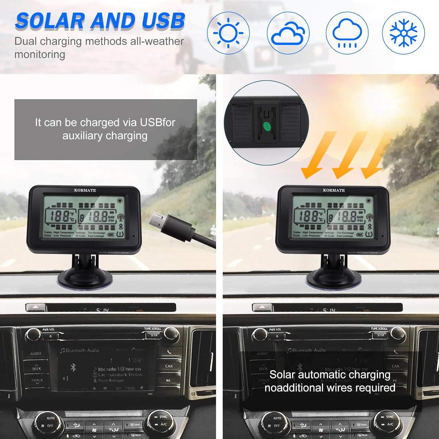 🚛 tpms tire pressure monitor system-Real-Time,kormate tpms supports USB cable and solar charging, It can be fast-charged without occupying the car cigarette lighter socket,tire monitoring system automatically enters sleep mode after 3 minutes of stopping to save power,The monitor automatically sleeps/wakes up by movement detection or you may wake it up by press the buttons.solar system model,tire pressure monitoring system,tire pressure monitor,rv tire pressure monitoring system.
