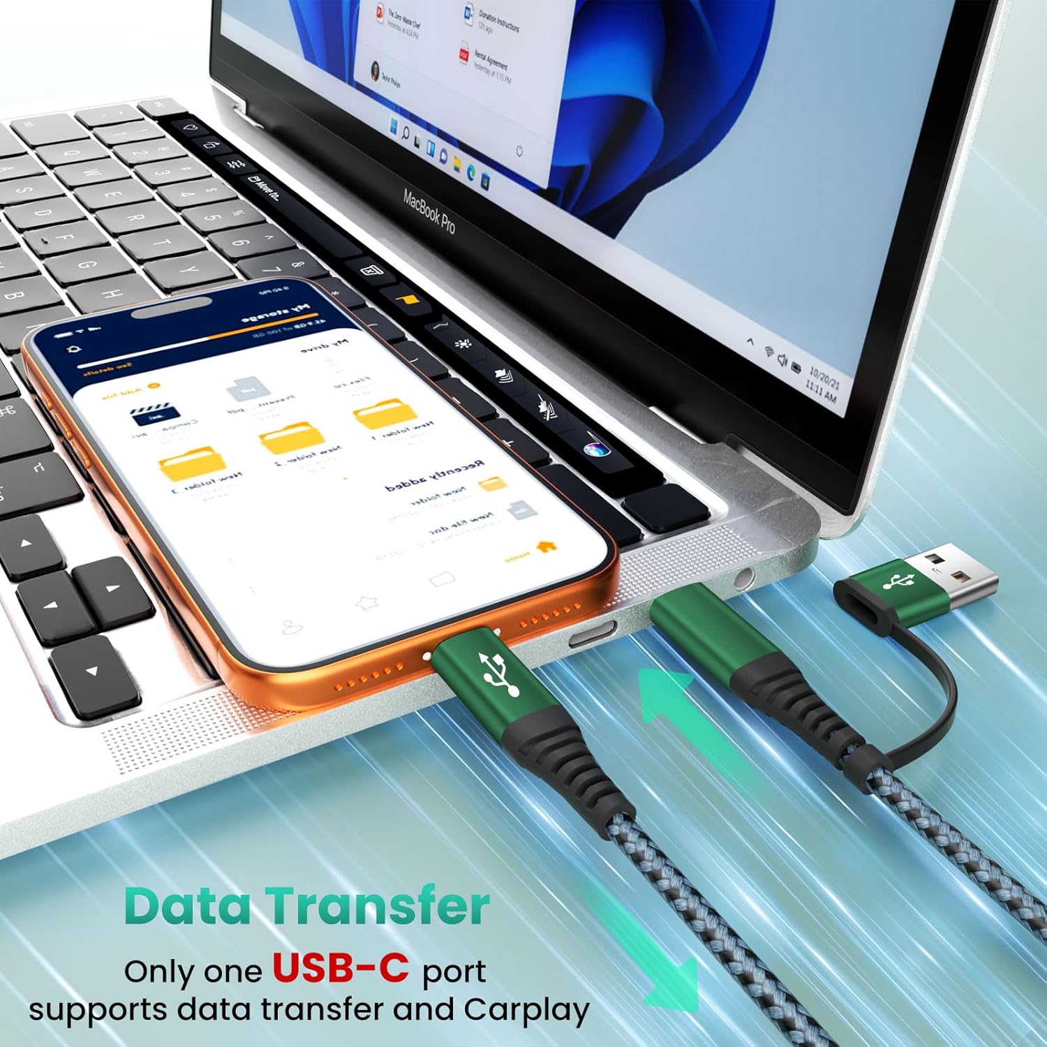【Car Accessories & Travel Essentials & Portable Design】With its lightweight and portable design, 5FT 3-in-2 iPhone iWatch charging cable is perfect for on-the-go use. Whether you’re traveling or at home or in the office, you can conveniently charge your devices anytime, anywhere, ideal for car, flight, hotels, cruises, office, college living, Europe vacation, road/business trip, camping or RV adventures(Note: Only USB-C Port support Android auto and CarPlay and Data Sync, 480Mbps)