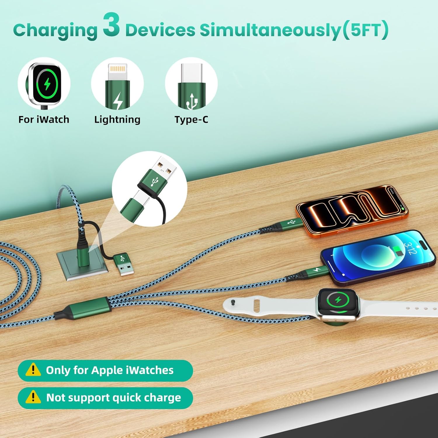 【Wide Compatibility】The 3 in 2 multi charging cable is compatible with iWatch Series Ultra 10/9/8/7/6/SE/5/4/3/2/1, iPhone 17/16/15/14/13/12/11/X/8 series, Air-pods 3/2/Pro, for Galaxy Ultra/ S25+/ S25/ S24+/ S24/ S23/ S23+/ S23/ S22/ S21/ S20/ S20+/ S20/ S10/ S9/ S8/ S7, LG, Pixel, HTC, One Plus, Moto, TWS headphones, Ps Console 5/4/3 and other USB C devices(Only for iWatch)
