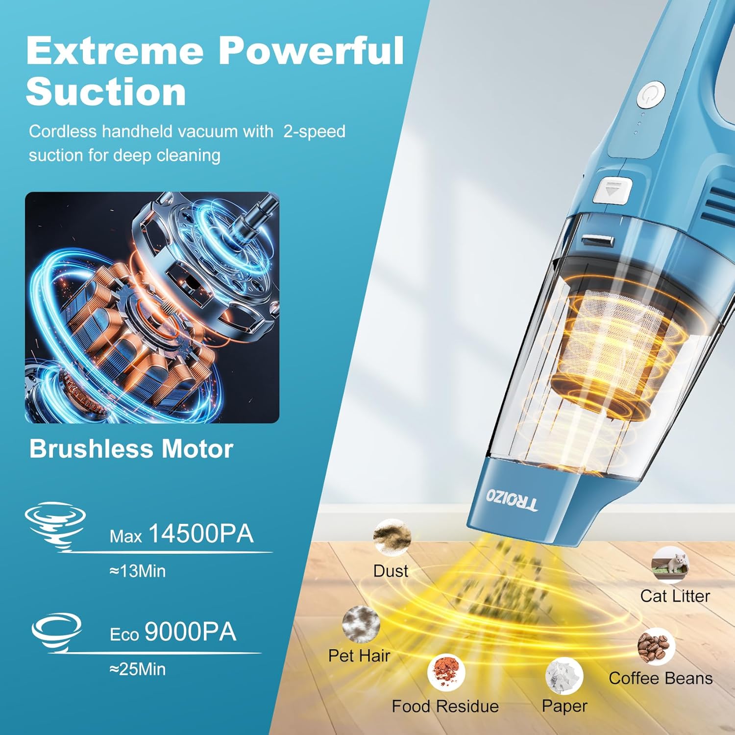 I’ve been using the TROIZO Handheld Vacuum Cordless for a while now, and I’m genuinely impressed by how much power this compact device delivers. The 14500PA suction is no joke—it’s strong enough to pick up crumbs, dust, pet hair, and even small debris without needing multiple passes.The brushless motor is one of my favorite features. It runs more quietly than my old handheld vacuum and feels smoother overall. Despite the strong suction, the vacuum stays relatively lightweight and easy to control, making it perfect for quick cleanups around the house, in the office, or inside the car.The cordless and rechargeable design adds real convenience. The battery life is solid for everyday spot cleaning, and it recharges quickly. Its portability makes it extremely handy for keeping in the car or grabbing for small messes without dragging out a full-size vacuum.I also appreciate the included attachments—especially the crevice tool and brush—which help with tight spaces and upholstery. For pet owners or parents, this is a great little tool to tackle everyday messes.Overall, the TROIZO handheld vacuum offers impressive suction, a modern efficient motor, and excellent portability. It’s a reliable, powerful mini-cleaner that’s worth the purchase.