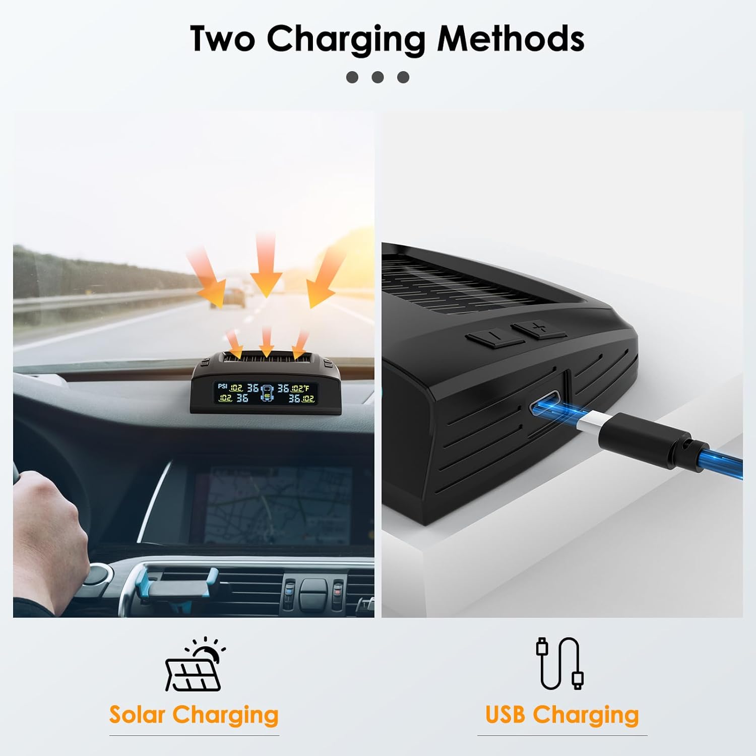 [Solar Charging and USB Charging]: The Tymate Tire Pressure Monitoring System offers two convenient charging options. Equipped with a solar lithium battery panel, it autonomously charges under sunlight, ensuring continuous battery life. Additionally, it can be supplemented by USB Type C charging when sunlight is unavailable. These dual charging methods enhance the Tymate Tire Pressure Monitoring System M7-3 with 6 External TPMS Sensors, extending its standby time for prolonged usability