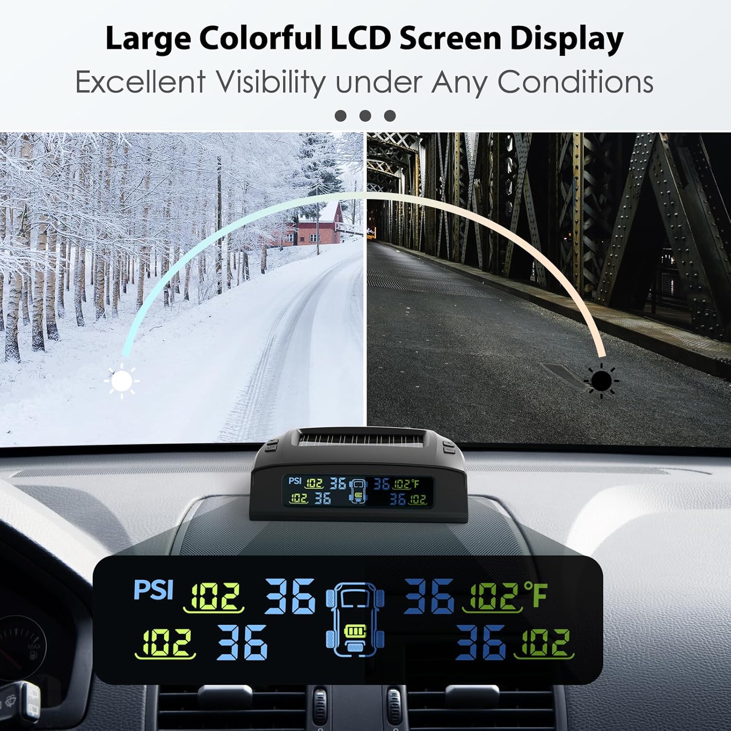 [Upgraded Color LCD Display and Live Monitoring]: The Tymate Tire Pressure Monitoring System M7-3 features an intelligent Color LCD screen that automatically adjusts backlighting in varying light conditions, ensuring clear data display. With real-time monitoring capabilities, it provides simultaneous display of data from all 6 sensors, allowing drivers to easily access tire pressure and temperature information whenever needed
