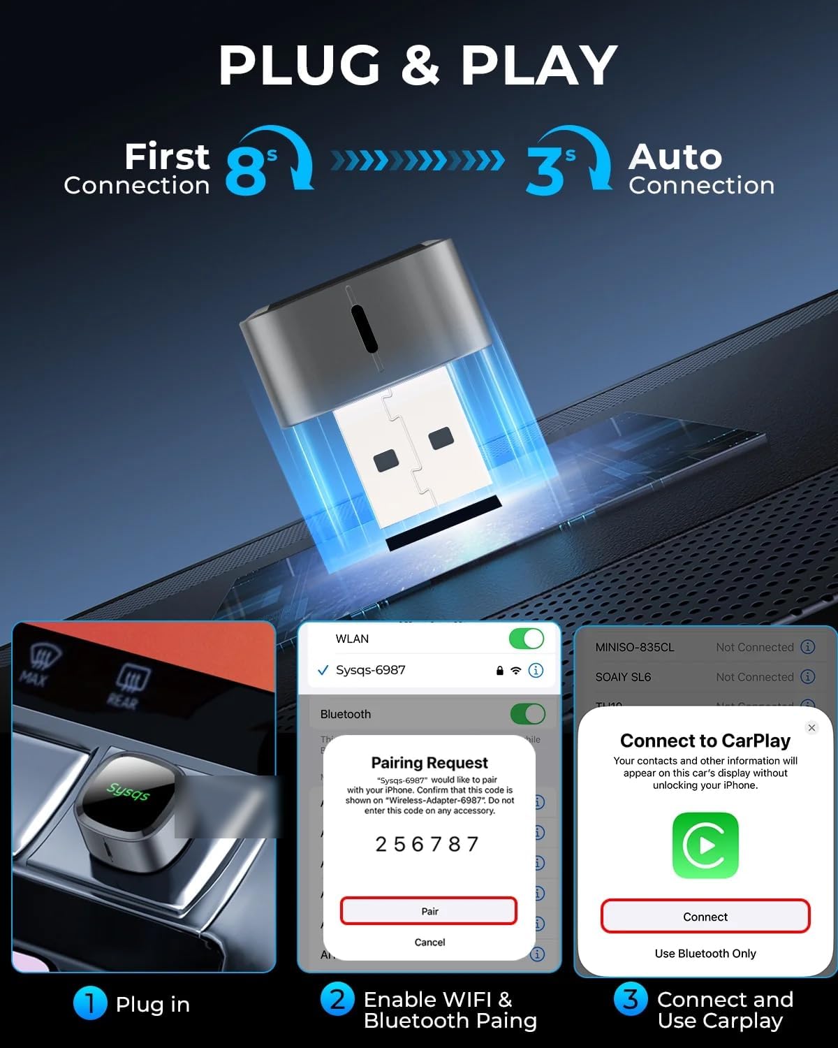 New Smart Auto-Connect supports multiple paired iPhones and automatically connects to the closest iPhone—no switching or re-pairing (perfect for multiple drivers).*VERY IMPORTANT* The adapter must be updated to the latest software before this functionality can be used. Plug & Play setup takes seconds with USB-A/USB-C support, and it auto-reconnects every time you start your car. Keep your dashboard clutter-free and enjoy a cleaner, safer wireless driving experience.