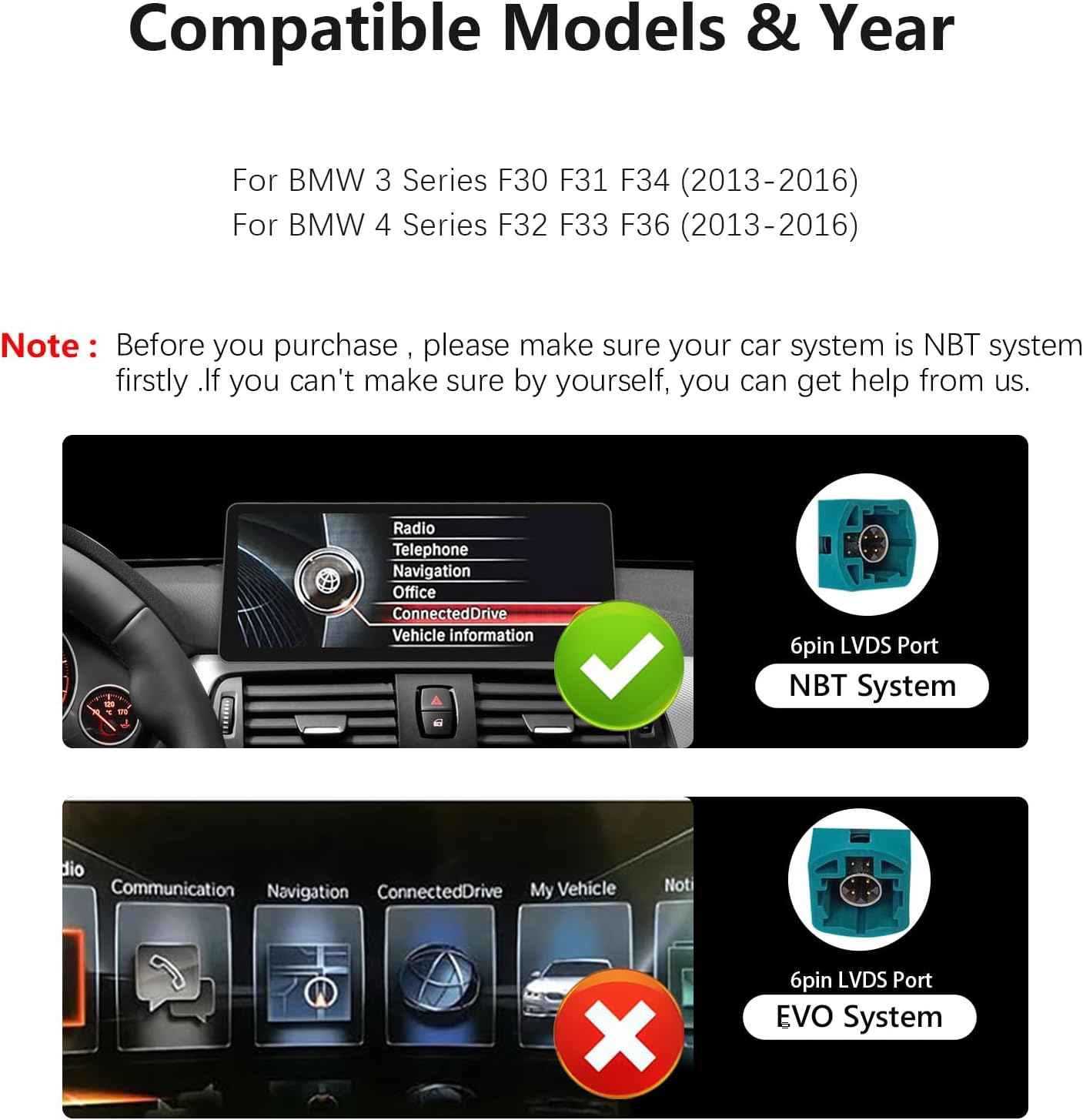 Plug and play,Suitable for .BMW 1 Series F20/F21 (2011-2016)Original NBT System. For BMW 2 Series F23 (2013-2016) Original NBT System. For BMW 3 Series F30/F31/F34 (2013-2016) Original NBT System For BMW 4 Series F32/F33/F36 (2013-2016) Original NBT System Note: This unit is for above BMW vehicles that come with Original NBT System.If you are unsure if this device is suitable for your vehicle, please contact us first