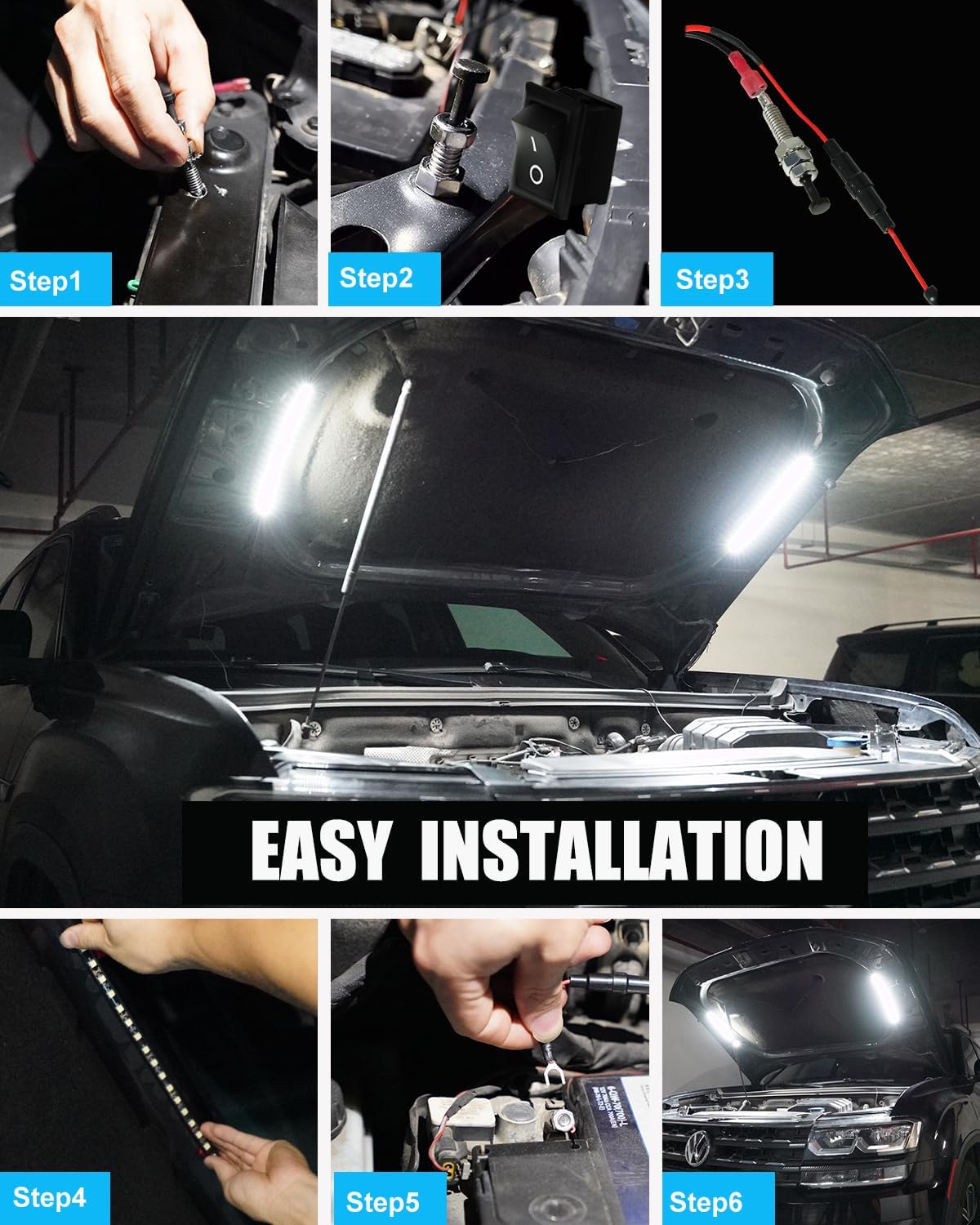 Easy Installation– This engine bay light kit easy to install wiring is very straight forward, the black wire is negative (-), the red wire is positive (+), connect to the positive pole of the car battery. NOTE: you may need to drill a hole for your application.
