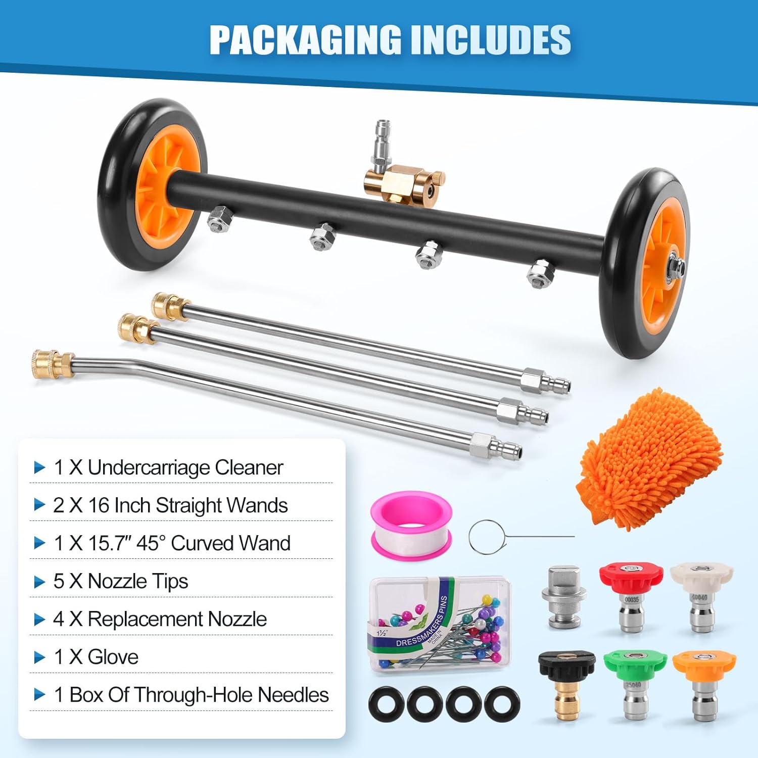 5 TIPS & WASH MITT: Under carriage power washer attachment includes a glove, 5 pressure nozzles tips ( red 0°, yellow 15°, green 25°, white 40°, and black 65°), 1 box of through-hole needles, and PTFE tape to help you achieve thorough cleaning