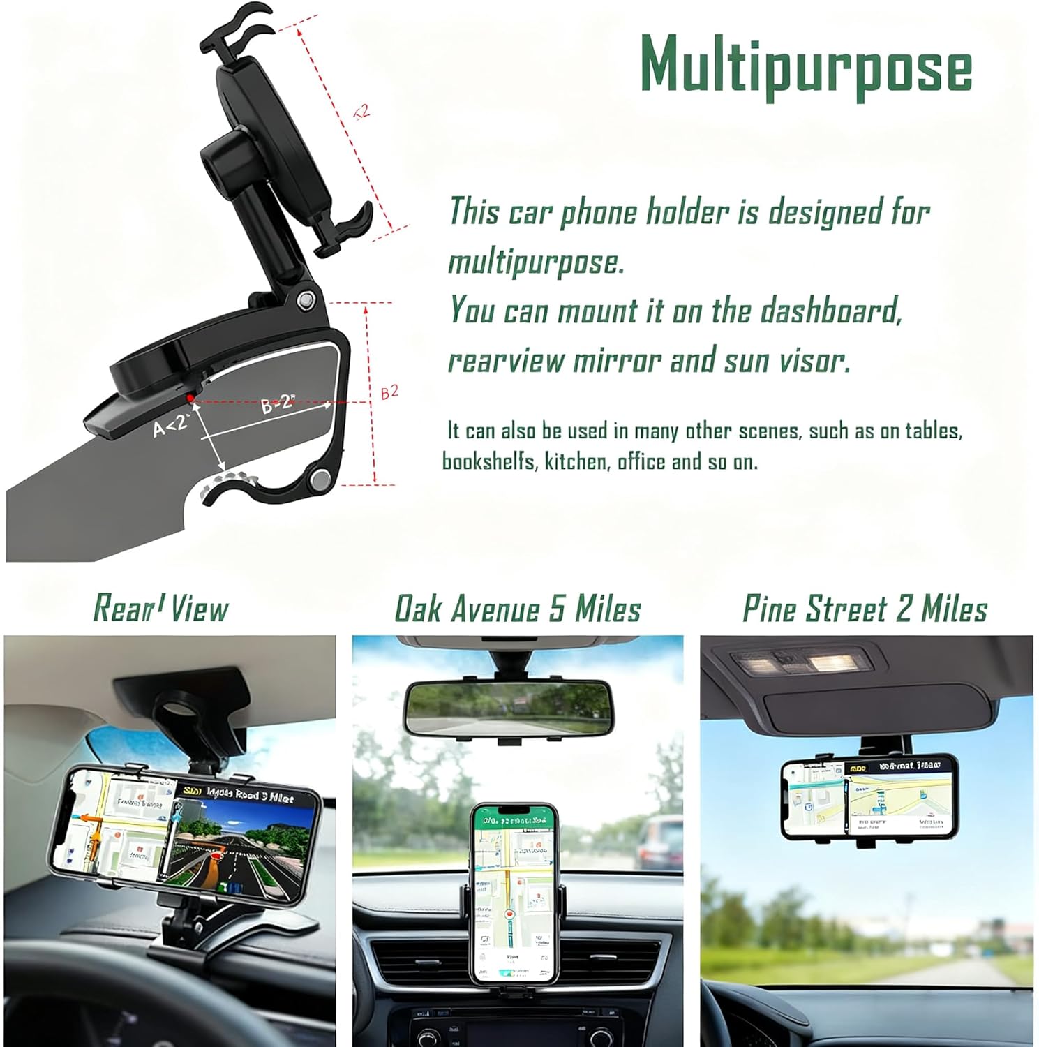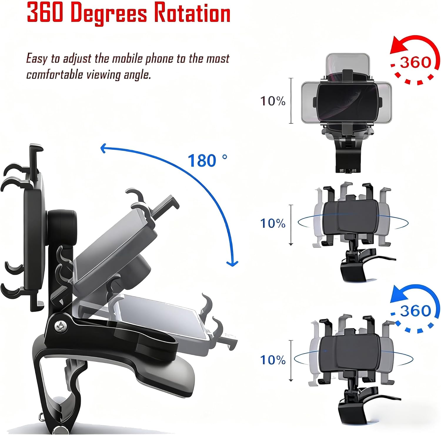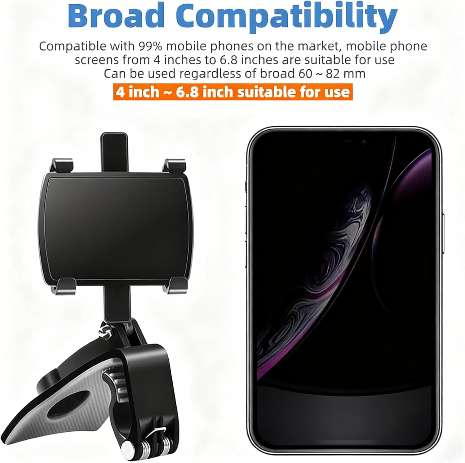 Main Features Multiple Purposes: dashboard, rearview mirror, sun visor, desk, bookshelf, kitchen, office and so on. 360 Degrees Rotation: can get the best viewing angle easily and avoid blocking the line of sight. Easy to Install: open the box,clamp to the car,put the phone in,done! Soft Silicon Pad and Sturdy Base: can hold your device firmly to prevent from scratching and dropping. Broad Compatibility: fit most phones from 4″ to 7″ in width that are less than 0.4″ thick. Note: Some mobile phone decorations or thick shells may affect the use of the mobile phone holder. Compatible with dashboards featuring an edge thickness of less than 2 inches and a depth greater than 2 inches. Please confirm whether this car mount is suitable for the dashboard of your vehicle before place order.