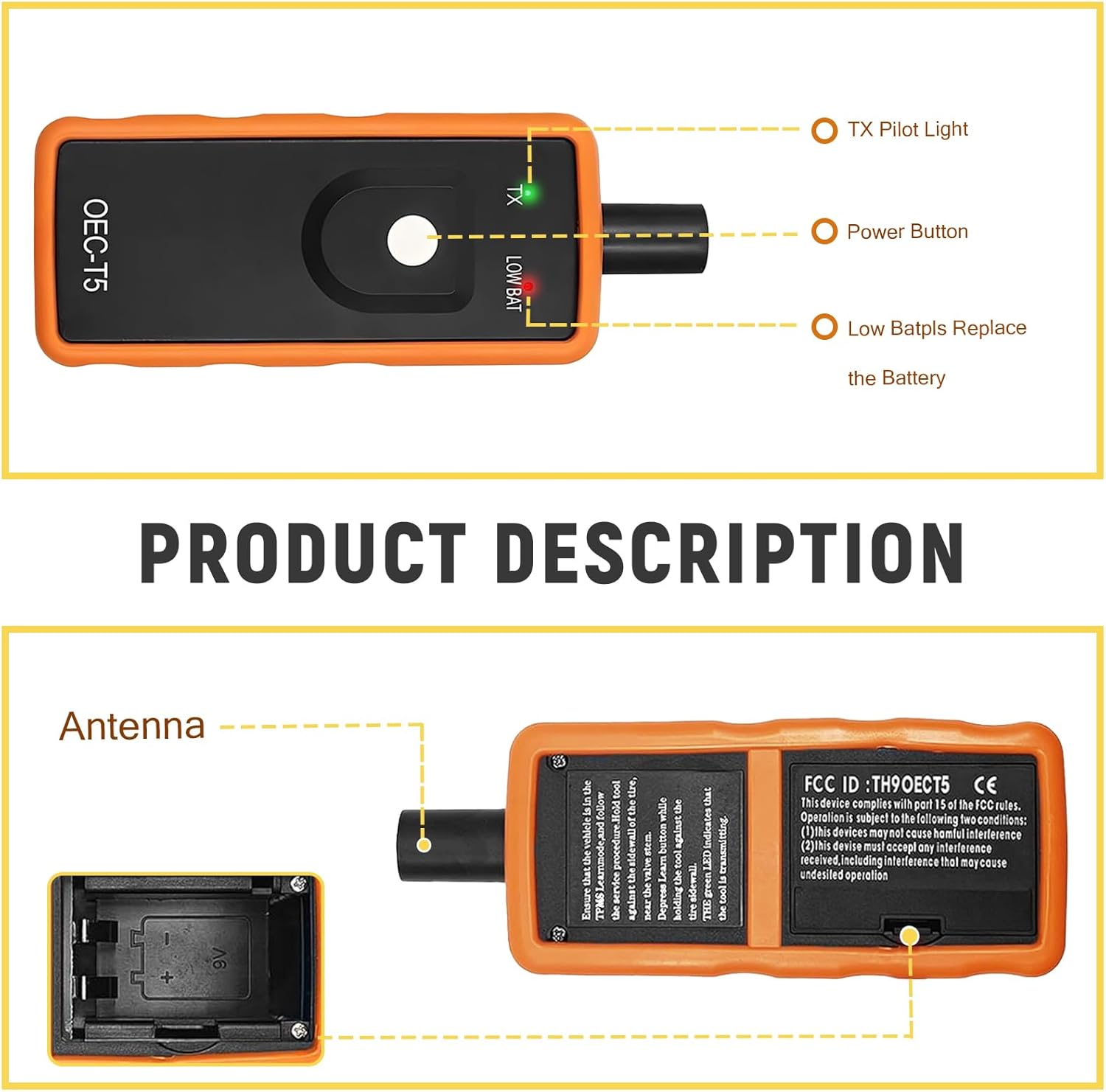 Easy to Use: The orange tire pressure monitor sensor TPMS for reset tool has a clear LED indicator and is simple to operate. Before use, ensure the vehicle is in TPMS learning mode. Then, place the tool close to the tire sidewall near the valve stem and press the learning button. Note: Make sure the battery is in good condition and the antenna is properly positioned during operation.