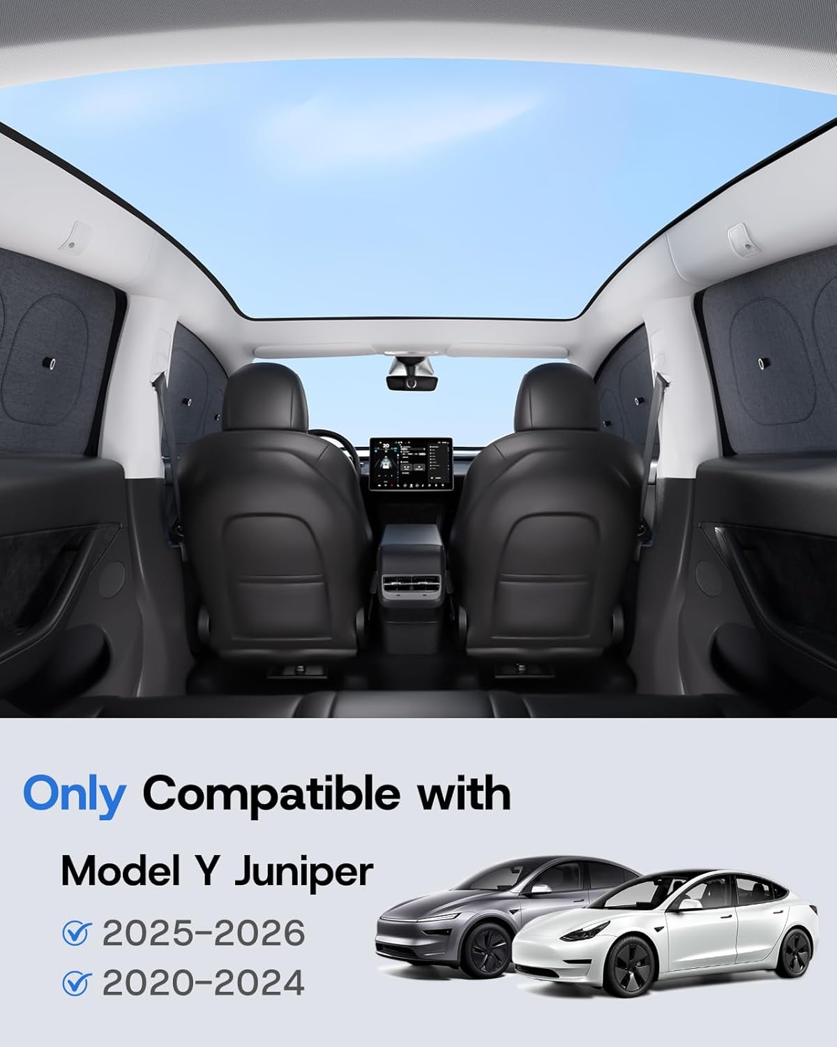 These are a good set of window shades for the 2026 Tesla Model Y. They provide good window coverage and the suction cups help to keep them in place making them easy to install. Probably better for camping than anything else as they do take a few minutes to install and once you open the door that shade will fall off most of the time since the windows move a bit down when the door is opened.The dark gray fabric on the inside helps keep things quiet too but I don’t care for the reflective outside fabric as it looks cheap. Again, good for camping but if you want to be stealthy, the shiny silver will defeat that. The product listing photos didn’t indicate the outside was shiny silver. You will still need a windshield shade.It comes with a nice storage bag. The large rear window shade is a bit tricky to collapse down to fit in the bag. A little on the pricey side.