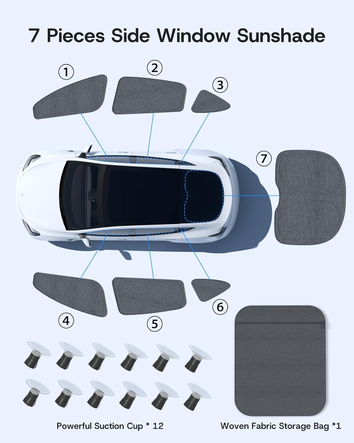 This multi-panel setup helps block solar heat and UV rays more effectively than a single windshield shade. It reduces cabin temperature and protect interior trim.These panels match the window contours well and minimize annoying gaps or flapping.The panels fold compactly and come with bags for easy storage. Once removed, they don’t take up too much space.However, aligning 7 separate pieces can be a bit fiddly, especially for first-time users. Some panels might seem to fight each other or interfere with window seals.Also, the shade fabric, stitching, or color may not perfectly match Tesla’s interior—some shade panels can feel a bit “aftermarket.”For Model Y owners who want serious sun blocking and privacy (for camping, sleeping, or reducing heat), this 7 piece shade kit is a solid upgrade over a single fixed windshield shade. If you’re okay with occasional fiddling, minor light leaks, and the learning curve of aligning multiple panels, this kit will deliver real comfort gains.