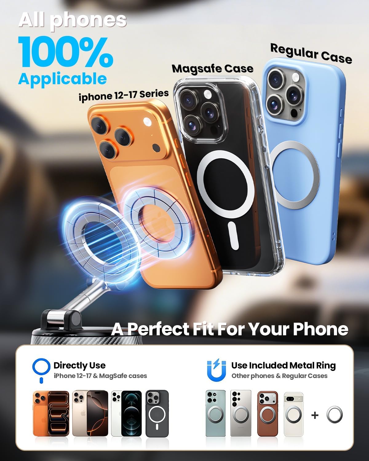 【Universal Compatibility】This vacuum suction and magnetic car phone mount is designed for the full iPhone series (17/16/15/14/13/12) and all MagSafe-compatible devices. For non-MagSafe phones, the included Metal Ring enables a strong, secure attachment. Whether your phone is caseless or in a case, it ensures a quick and firm one-handed snap into place
